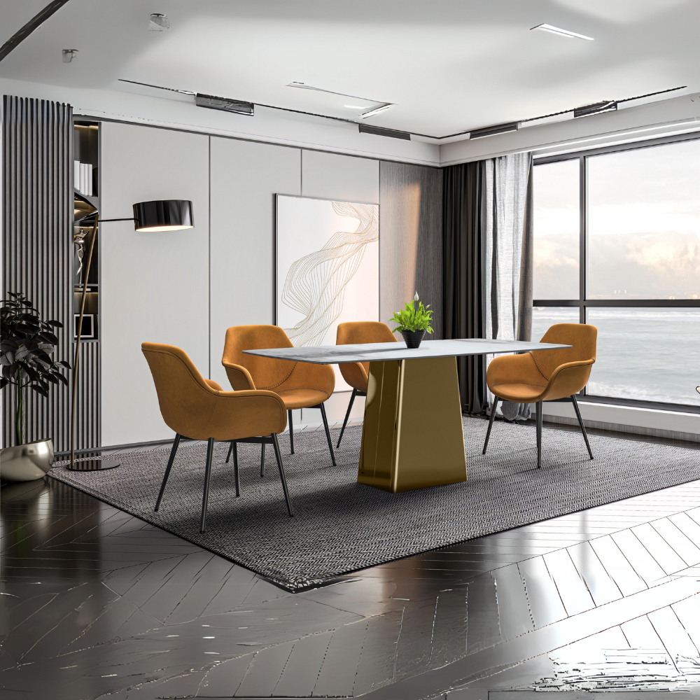- Choose between a sintered stone or glass top, both of which offer a combination of durability and elegance. The sintered stone surface offers both heat and scratch resistance, while the glass top enhances sophistication by beautifully reflecting light, creating a visually striking dining space.