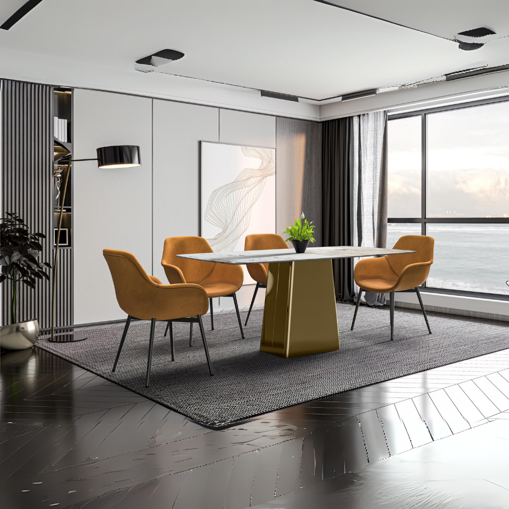 • Choose between a sintered stone or glass top, both of which offer a combination of durability and elegance. The sintered stone surface offers both heat and scratch resistance, while the glass top enhances sophistication by beautifully reflecting light, creating a visually striking dining space.