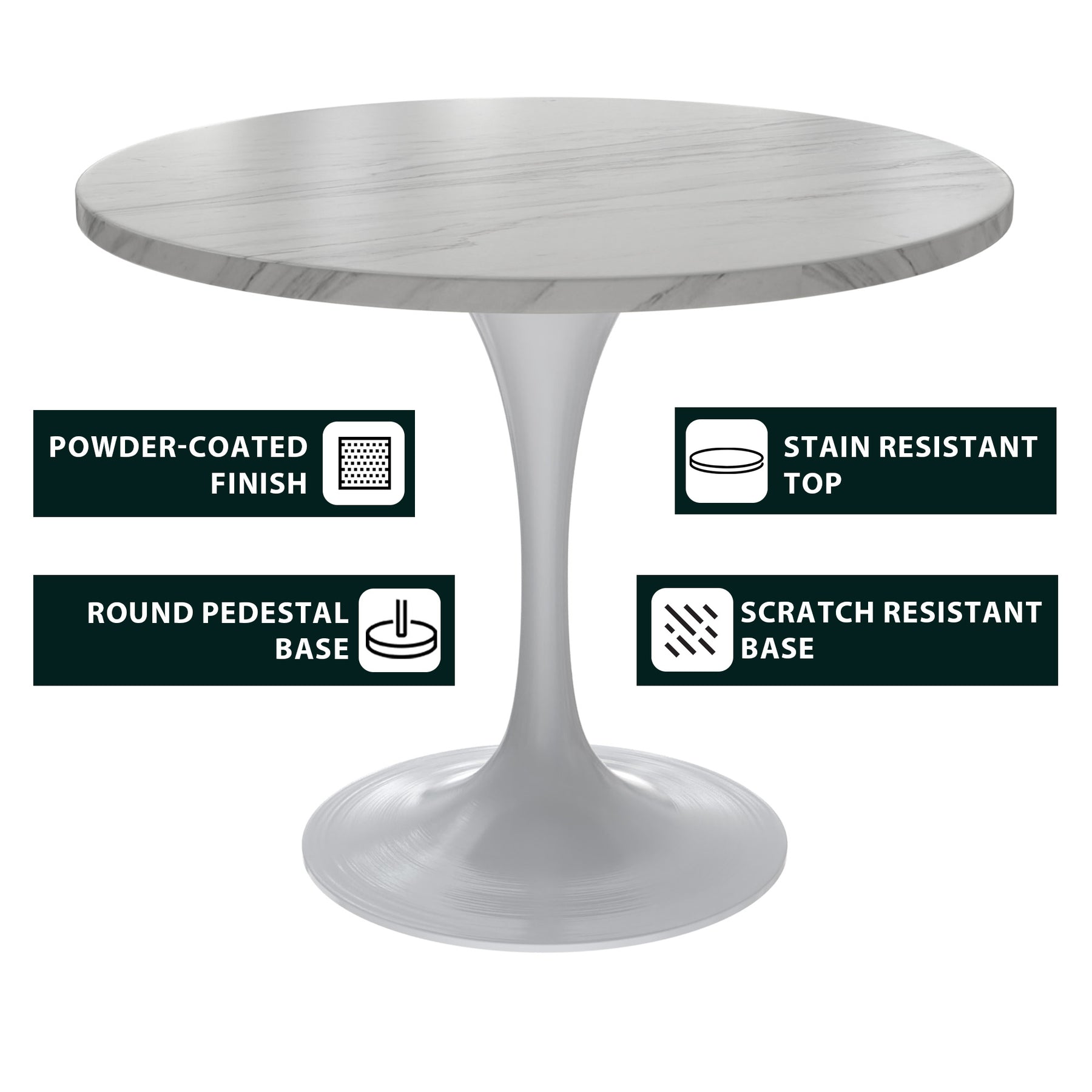- Providing a sturdy foundation for the stylish tabletop is the white steel pedestal base. Steel is known for its durability, making it an ideal material for a piece of furniture that is meant to withstand the test of time.