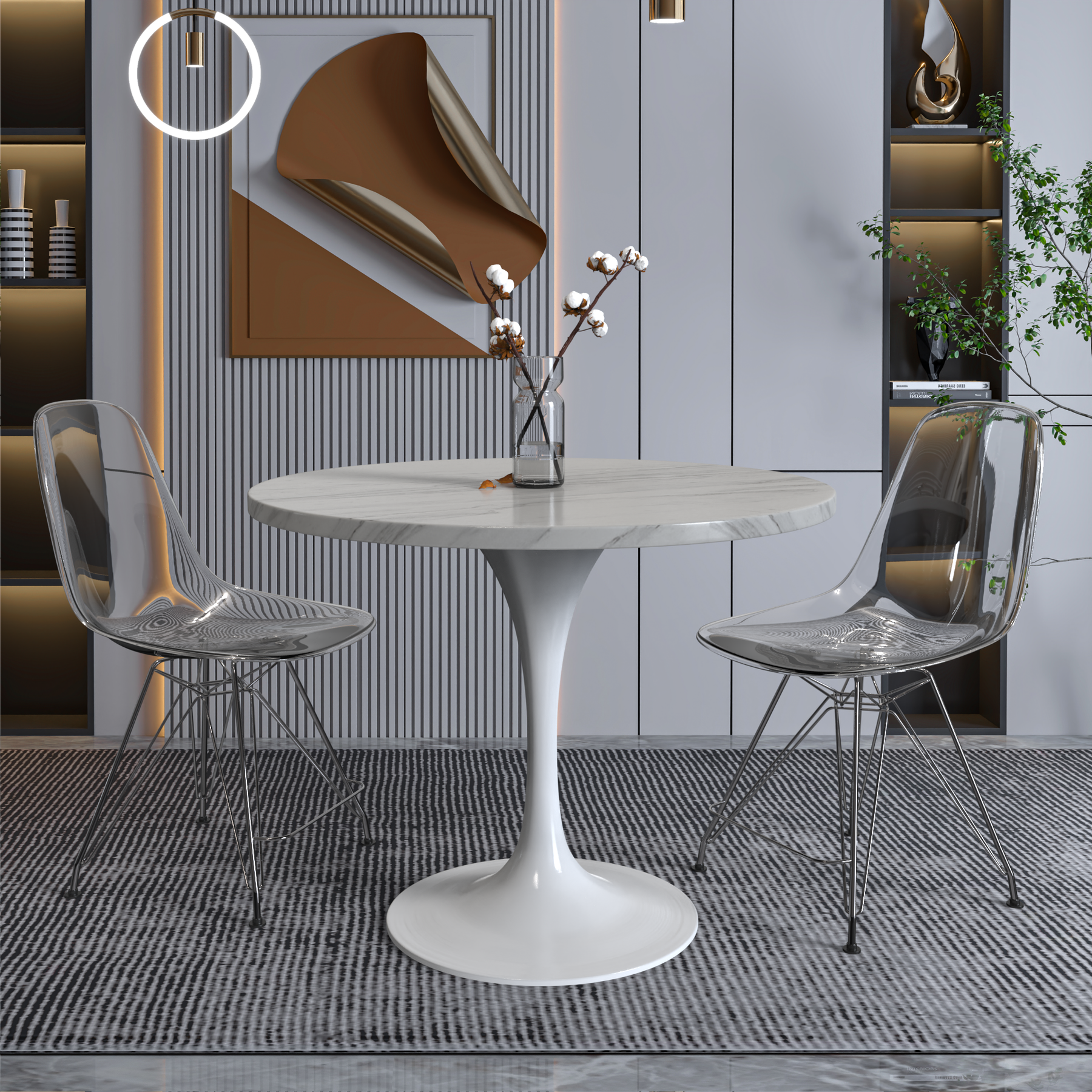 The Verve Dining Table stands as a testament to the perfect fusion of design and functionality, transforming your kitchen or dining room into a space of elegance and sophistication. At the heart of its design is the distinctive 36-inch circular tabletop, a central feature that not only captures attention but also sets the tone for a convivial dining experience. Crafted from cutting-edge sintered stone, the tabletop is a masterpiece of durability and style. Sintered stone, renowned for its robustness, proves to be an ideal choice for a surface that experiences the rigors of daily use in a dining room setting. The foundation of this exceptional dining table is the white steel pedestal base, offering sturdy support and a touch of modern elegance. Steel, celebrated for its durability, ensures that the dining table stands the test of time, resisting wear and tear while. The well-proportioned round pedestal base is a design choice that goes beyond stability – it contributes significantly to the overall aesthetic of the dining table. maintaining its structural integrity. Assembling the Dining Table is a straightforward process, reinforcing its commitment to user convenience. The package includes comprehensive instructions and all the necessary hardware, enabling you to have this stunning dining table ready for use with minimal effort.