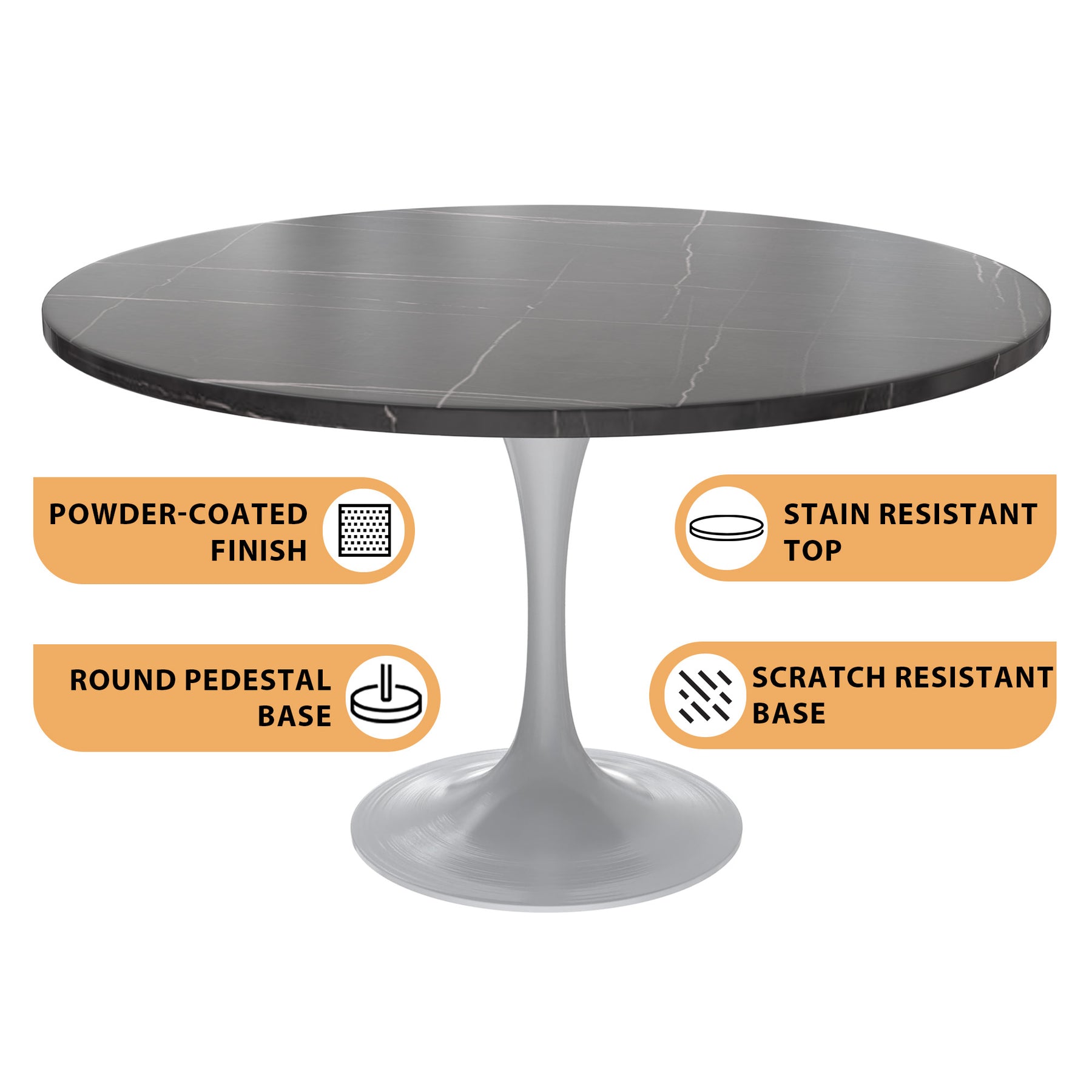 • The steel base is adorned with a powder-coated finish in a pristine white color. The powder coating enhances the base's resistance to scratches and corrosion, ensuring that your table retains its polished look for years to come.