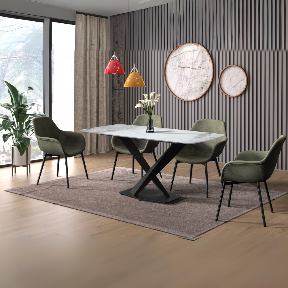 - Crafted from premium sintered stone or glass tabletops, our LeisureMod Voren modern dining table boasts advanced materials renowned for their durability and minimal upkeep requirements. The surfaces not only enhance the aesthetic allure of your dining area but also infuses a touch of luxury