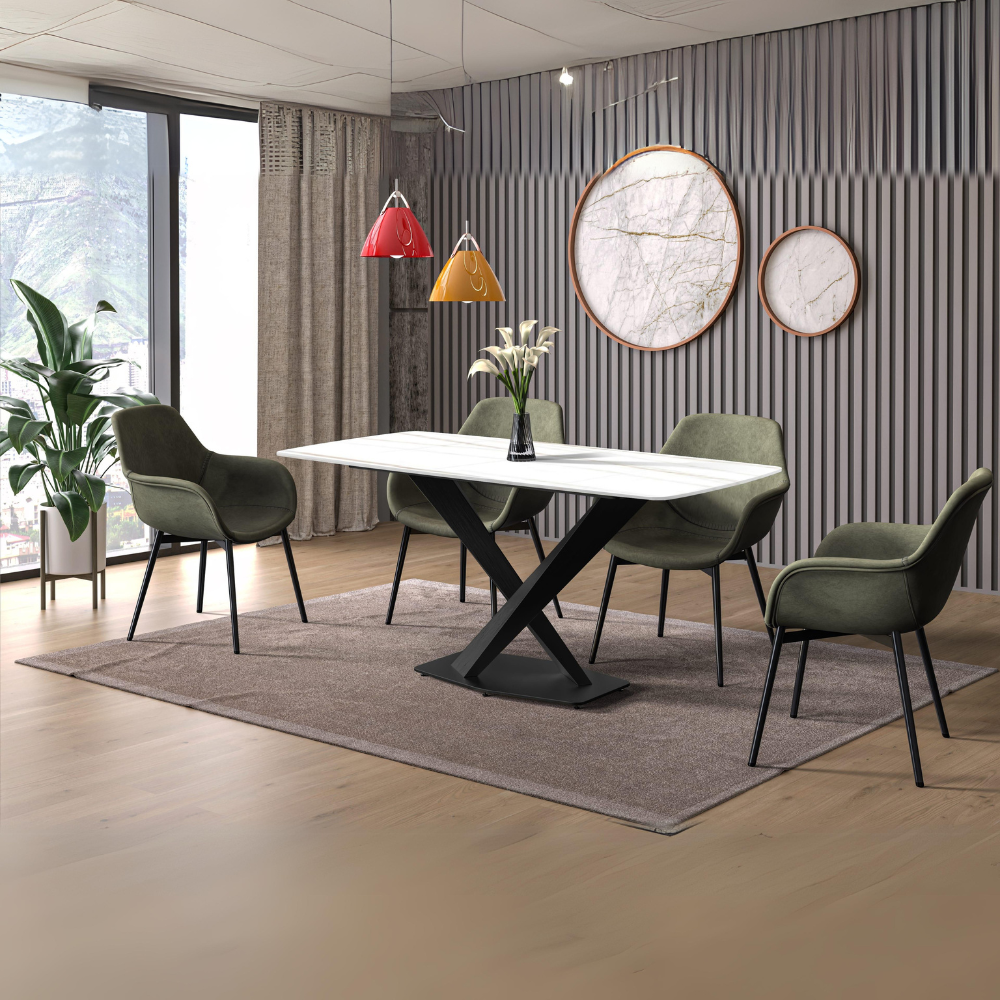 - Crafted from premium sintered stone or glass tabletops, our LeisureMod Voren modern dining table boasts advanced materials renowned for their durability and minimal upkeep requirements. The surfaces not only enhance the aesthetic allure of your dining area but also infuses a touch of luxury