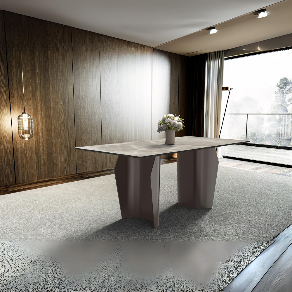 - The modern dining table features a rectangular tabletop crafted from durable materials such as glass or stone, known for their stylish appearance and lasting durability. This ensures the table not only looks great but also serves its purpose effectively. With its sturdy build, it can withstand daily use while maintaining its elegant appeal, making it a perfect addition to your dining space.
