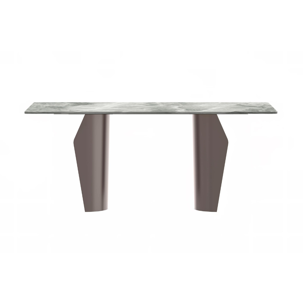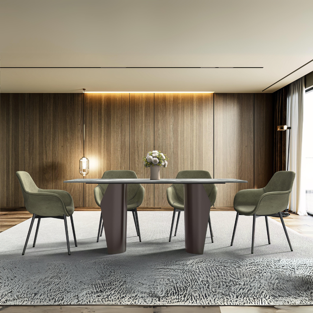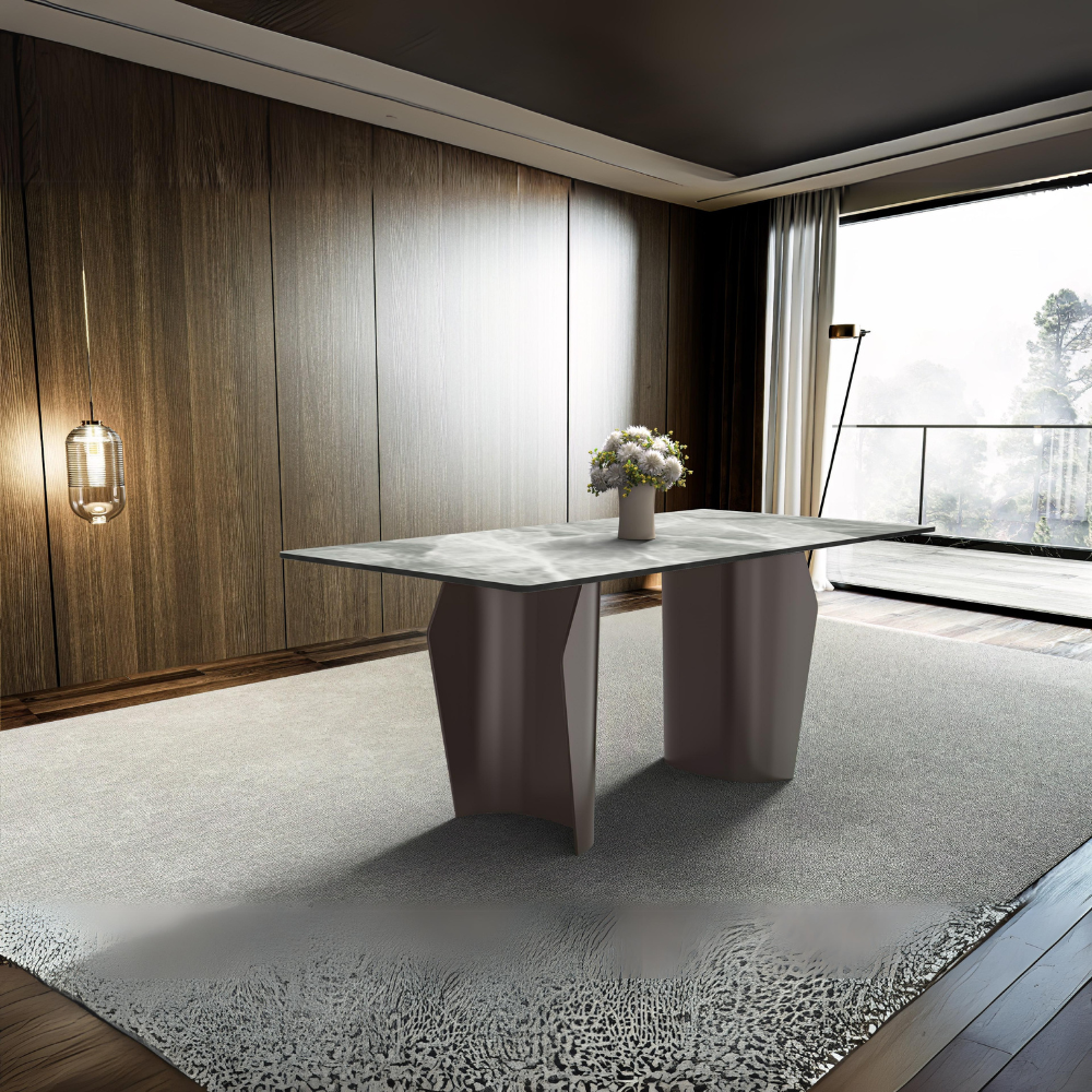 - The modern dining table features a rectangular tabletop crafted from durable materials such as glass or stone, known for their stylish appearance and lasting durability. This ensures the table not only looks great but also serves its purpose effectively. With its sturdy build, it can withstand daily use while maintaining its elegant appeal, making it a perfect addition to your dining space.