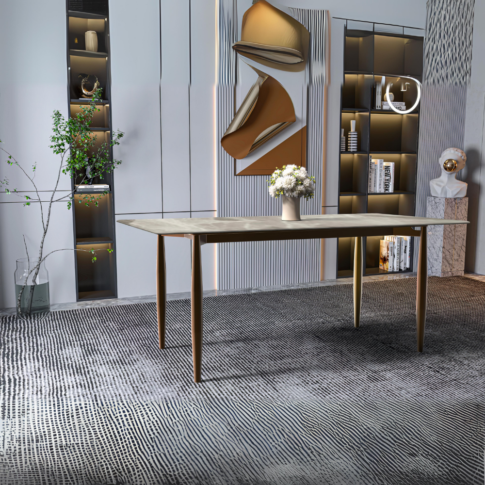 The Skyline Zinti Modern Dining Table effortlessly blends style and functionality, drawing inspiration from mid-century charm to elevate any dining space. Its sleek design exudes sophistication, while the generously sized rectangular tabletop provides ample room for dining and socializing. Supported by sturdy steel legs, stability is ensured for shared meals and cherished moments alike. Crafted from durable sintered stone or glass, the tabletop is scratch-resistant and easy to clean, enhancing your dining experience. Whether it's a casual dinner or a formal gathering, the Skyline Zinti Modern Dining Table offers both comfort and elegance for every occasion.