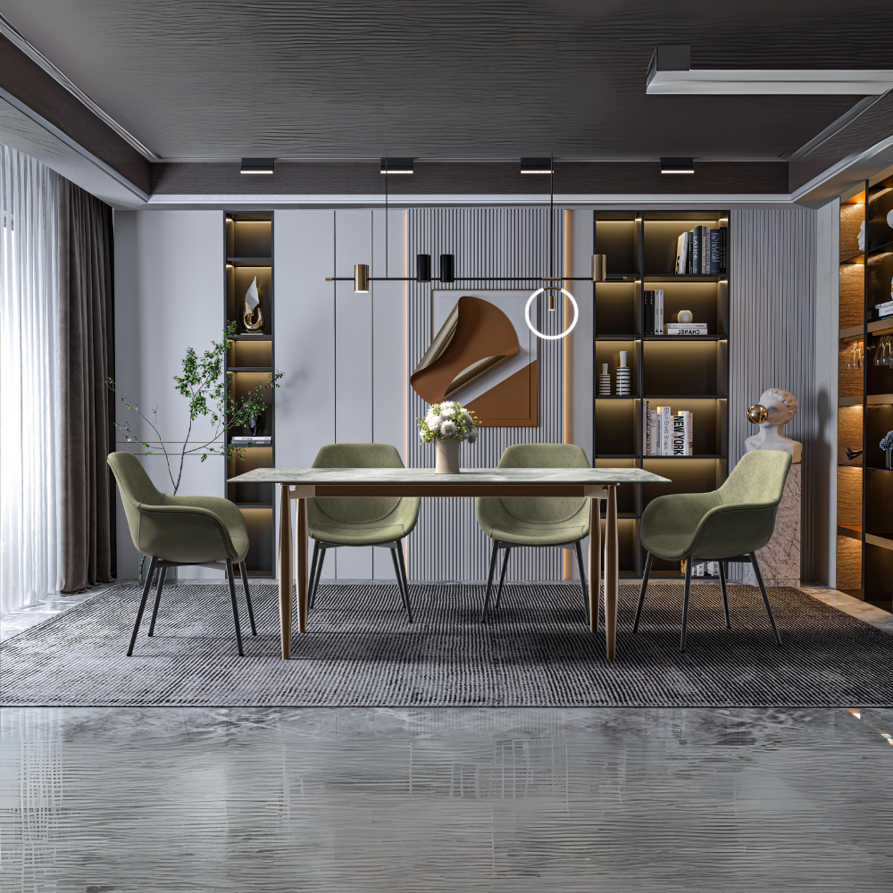 - Customize your dining setup with the modern dining table's versatile tabletop options. Opt for the sleek glass top for a contemporary appeal that's effortless to maintain or select the durable sintered stone top for a sophisticated and practical touch. Whether you favor modern allure or timeless elegance, both materials empower you to personalize the table according to your unique style and preferences.