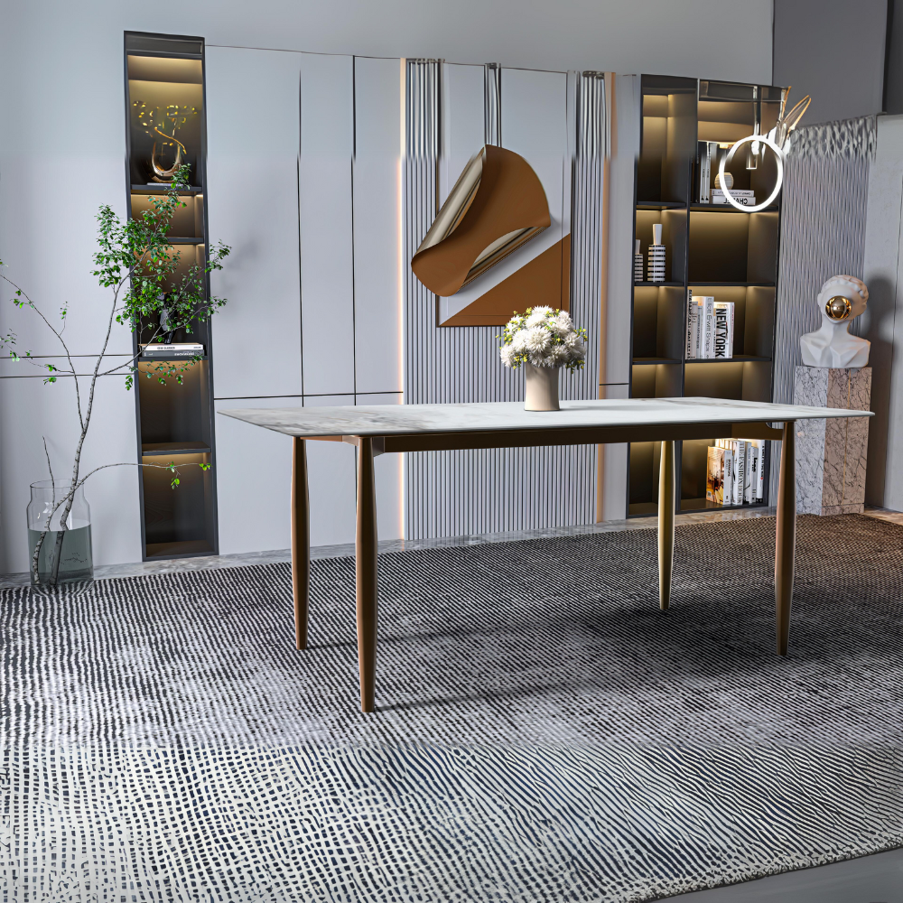 The Skyline Zinti Modern Dining Table effortlessly blends style and functionality, drawing inspiration from mid-century charm to elevate any dining space. Its sleek design exudes sophistication, while the generously sized rectangular tabletop provides ample room for dining and socializing. Supported by sturdy steel legs, stability is ensured for shared meals and cherished moments alike. Crafted from durable sintered stone or glass, the tabletop is scratch-resistant and easy to clean, enhancing your dining experience. Whether it's a casual dinner or a formal gathering, the Skyline Zinti Modern Dining Table offers both comfort and elegance for every occasion.