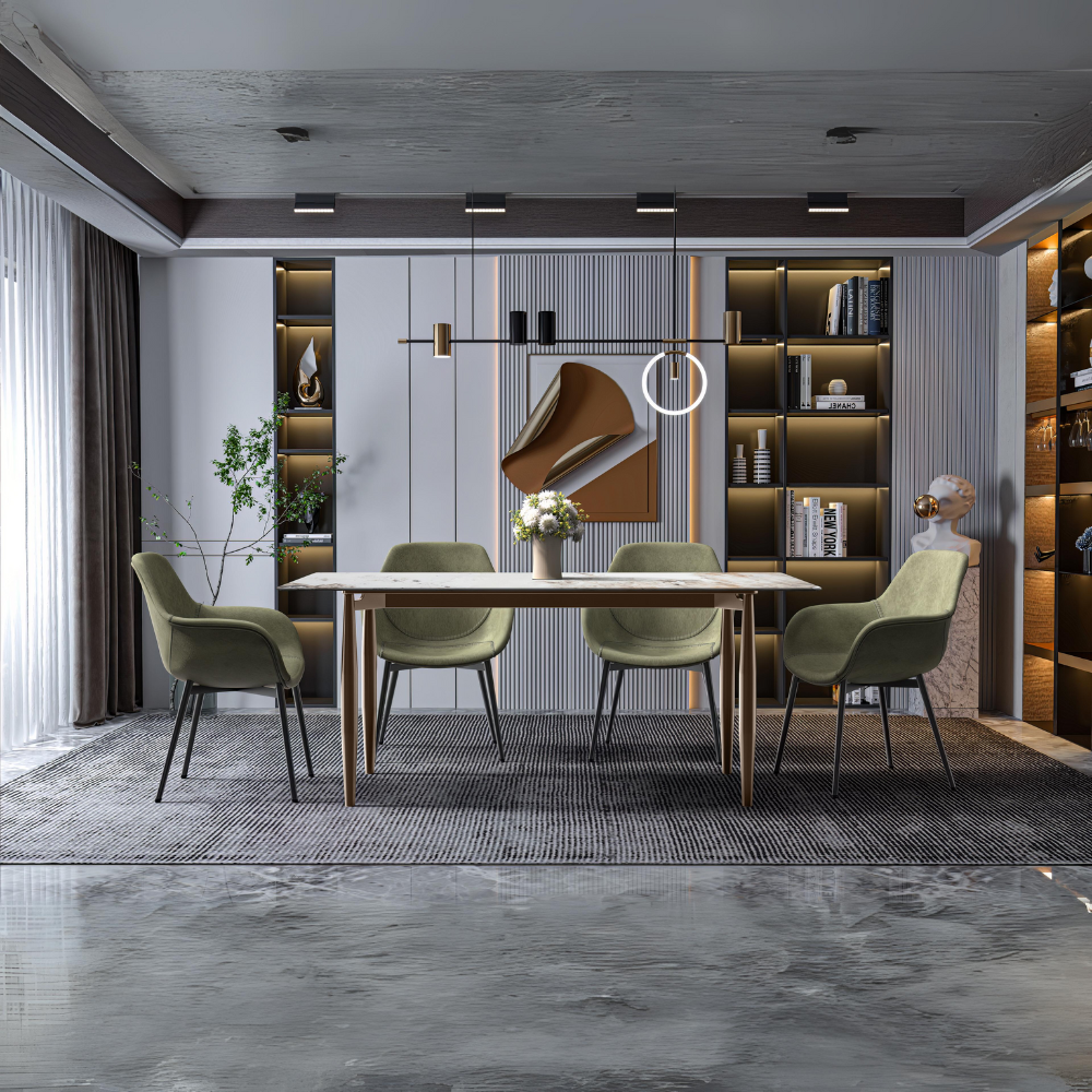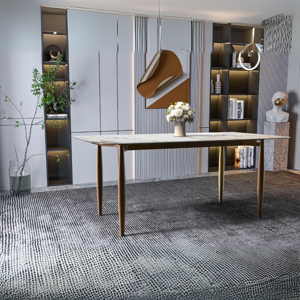 Zinti Series Modern Dining Table Bronze Base, With 62" White Grey Sintered Stone Top