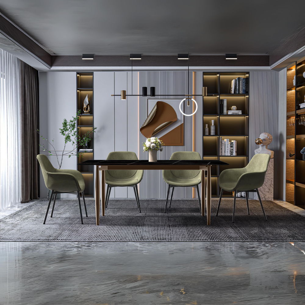 - Customize your dining setup with the modern dining table's versatile tabletop options. Opt for the sleek glass top for a contemporary appeal that's effortless to maintain or select the durable sintered stone top for a sophisticated and practical touch. Whether you favor modern allure or timeless elegance, both materials empower you to personalize the table according to your unique style and preferences.