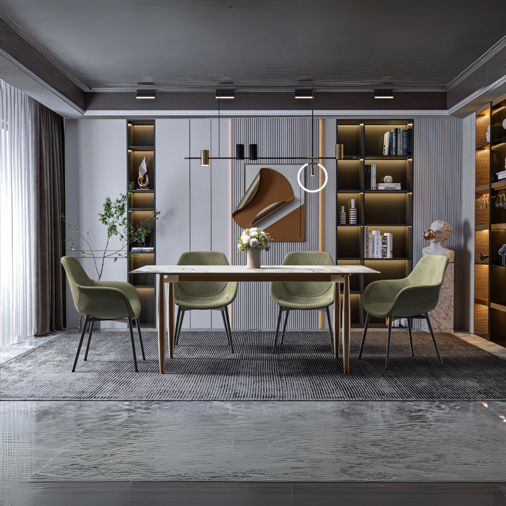 • Customize your dining setup with the modern dining table's versatile tabletop options. Opt for the sleek glass top for a contemporary appeal that's effortless to maintain or select the durable sintered stone top for a sophisticated and practical touch. Whether you favor modern allure or timeless elegance, both materials empower you to personalize the table according to your unique style and preferences.