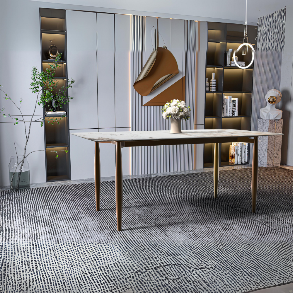 • Simplify upkeep with the Zinti modern dining table's premium glass or sintered stone tabletop and sturdy steel legs. Effortlessly wipe the smooth surface with a damp cloth to remove stains or spills, keeping the table pristine and stain-resistant for long-lasting enjoyment.