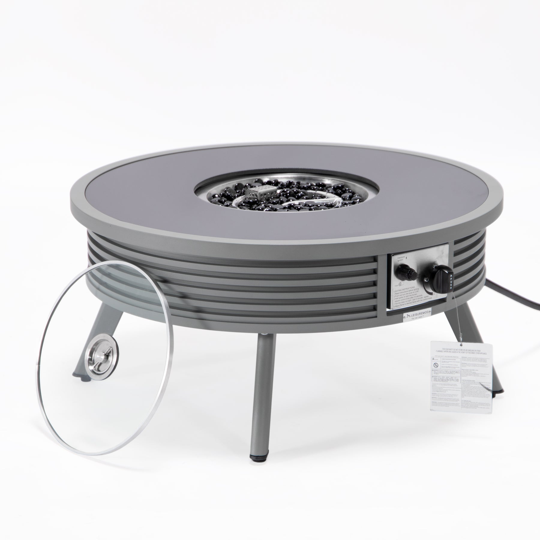 - The modern Round fire pit table features a powder-coated finish, providing a sleek and durable surface. This finish not only adds a touch of elegance but also protects the aluminum frame from corrosion, and other outdoor elements.