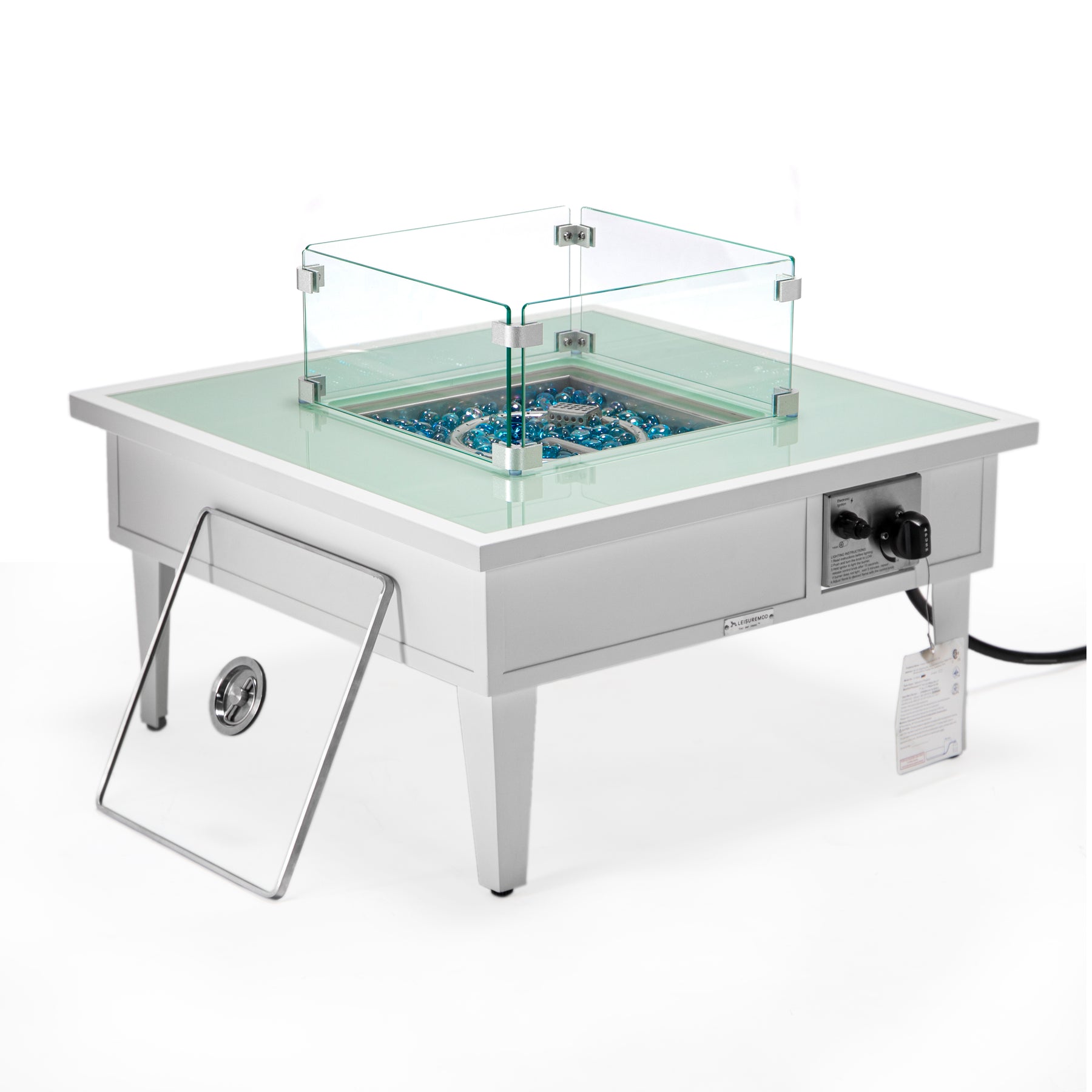 - The modern square fire pit table is equipped with a tempered glass shield that surrounds the fire area it adds an elegant touch to the fire pit table and enhances the overall aesthetic appeal.