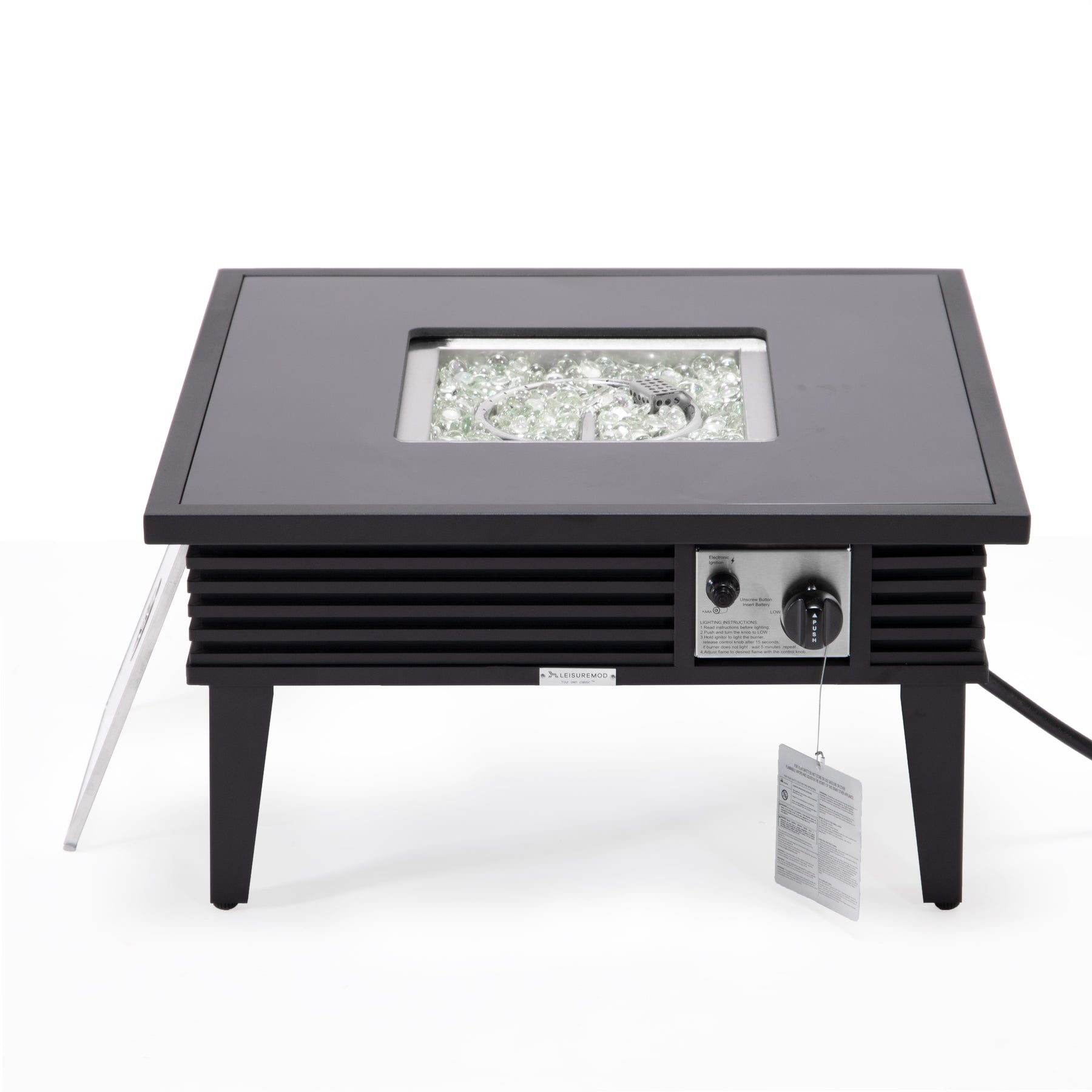 - The modern square fire pit table comes with a lid, allowing you to convert it into a functional table when not in use. The crystal stones included will add touch of elegance and sophistication to the flames.