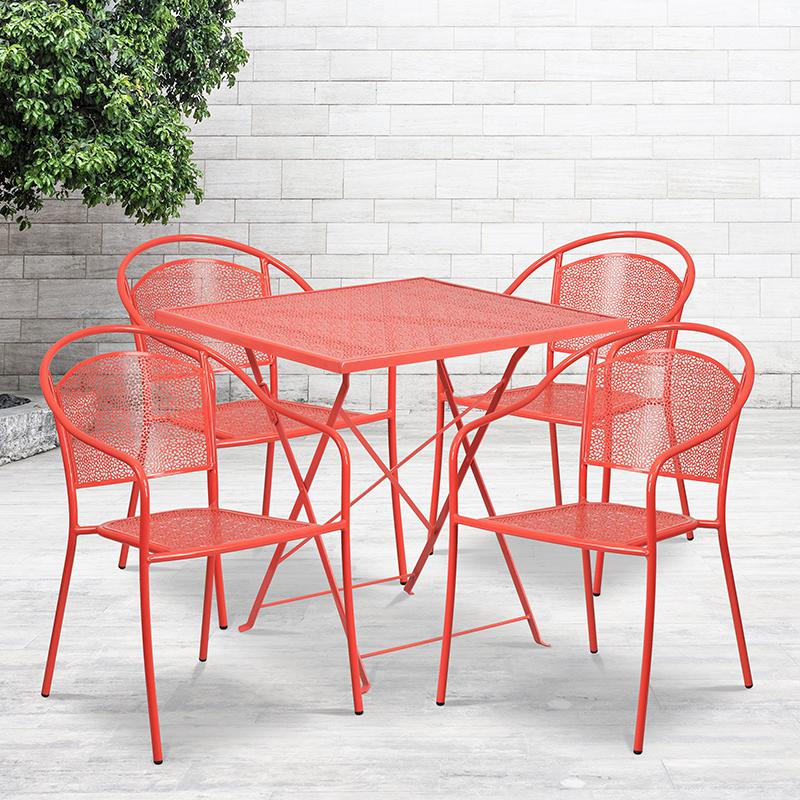 Commercial Grade 28" Square Coral Indoor-Outdoor Steel Folding Patio Table Set with 4 Round Back Chairs