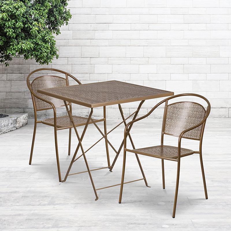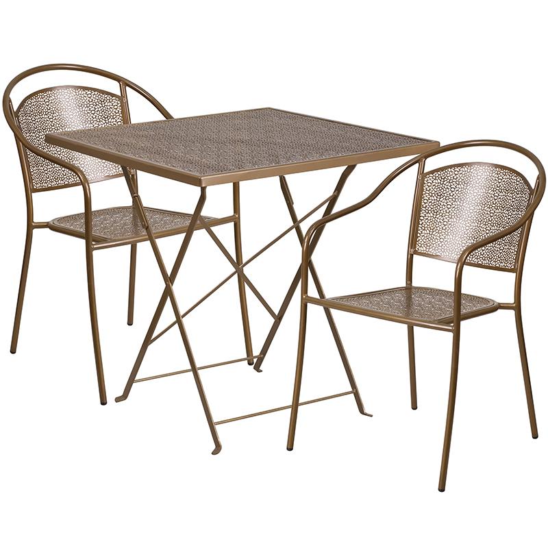 Commercial Grade 28" Square Gold Indoor-Outdoor Steel Folding Patio Table Set with 2 Round Back Chairs