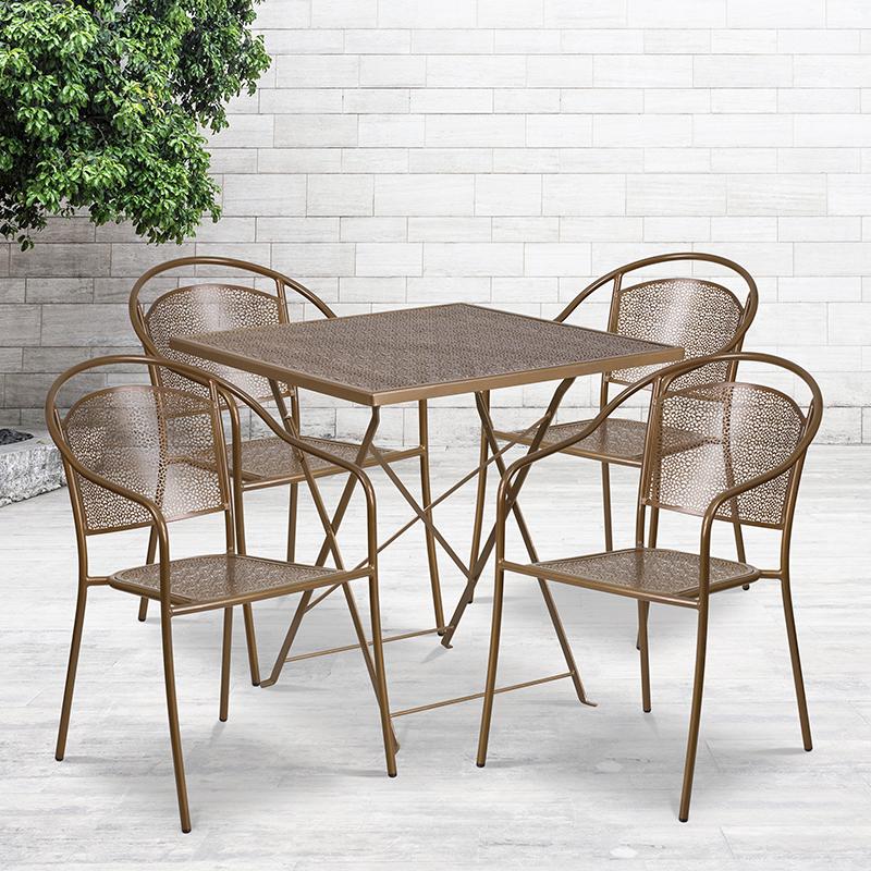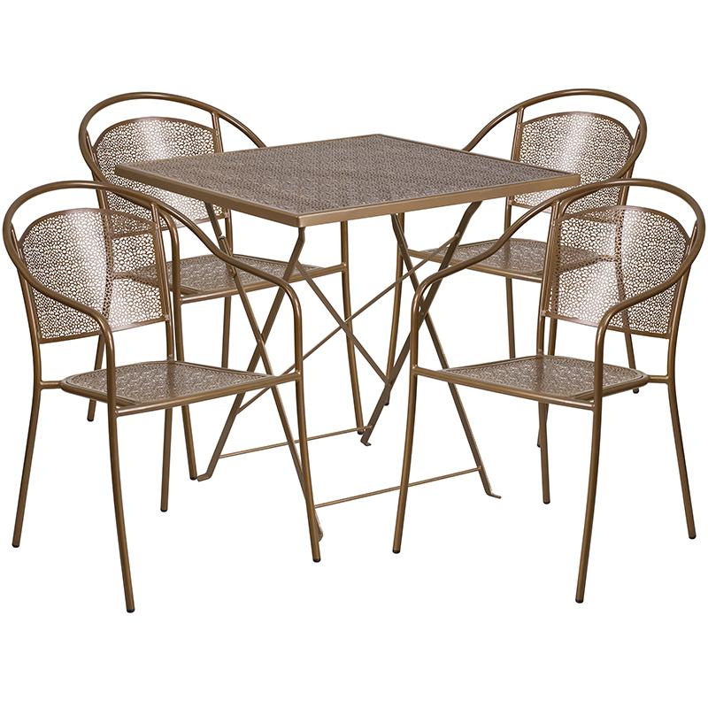 Commercial Grade 28" Square Gold Indoor-Outdoor Steel Folding Patio Table Set with 4 Round Back Chairs