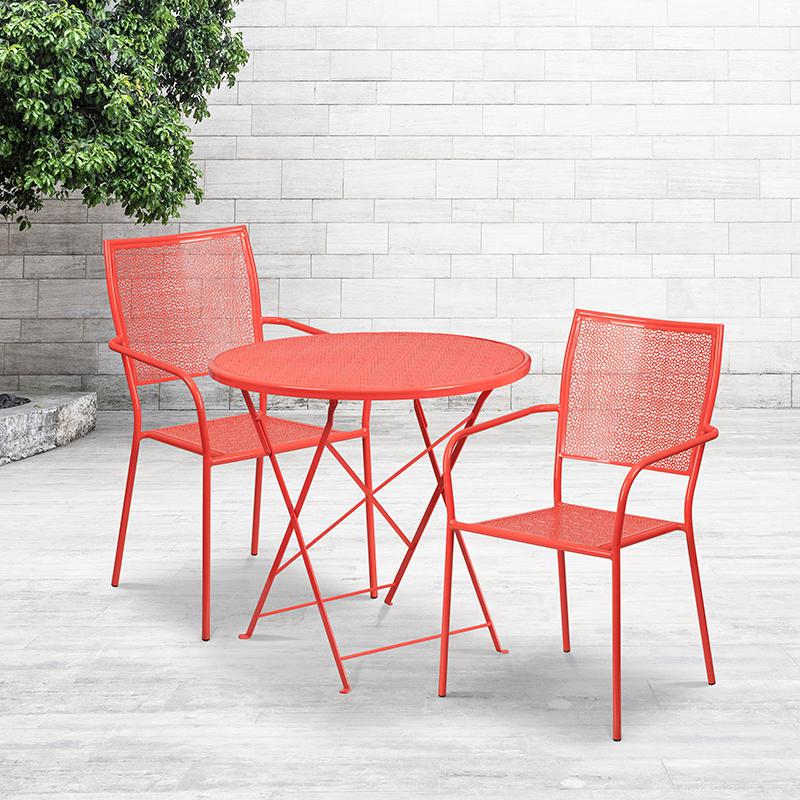 Commercial Grade 30" Round Coral Indoor-Outdoor Steel Folding Patio Table Set with 2 Square Back Chairs