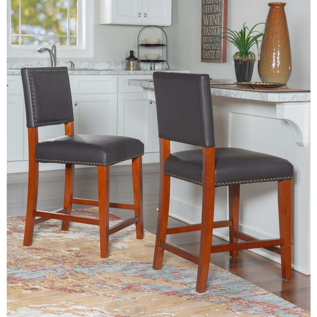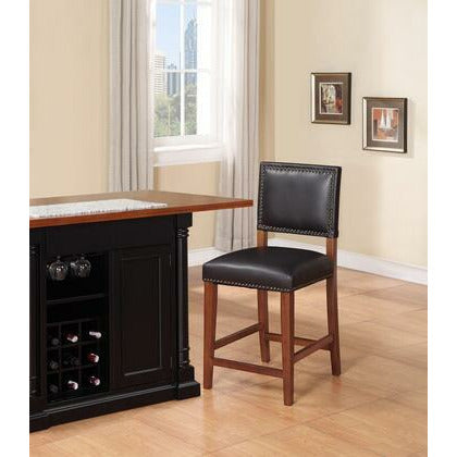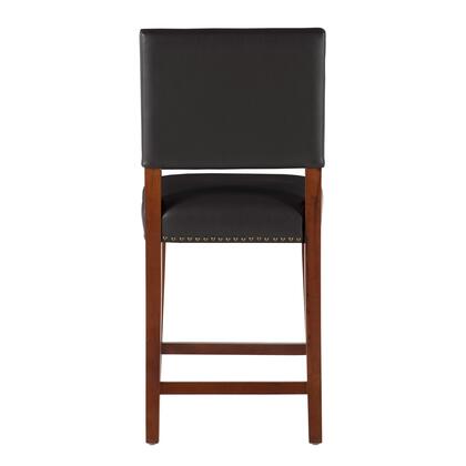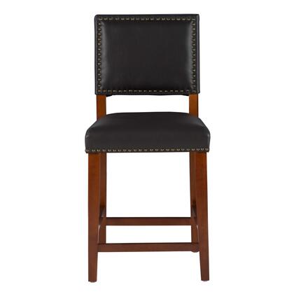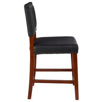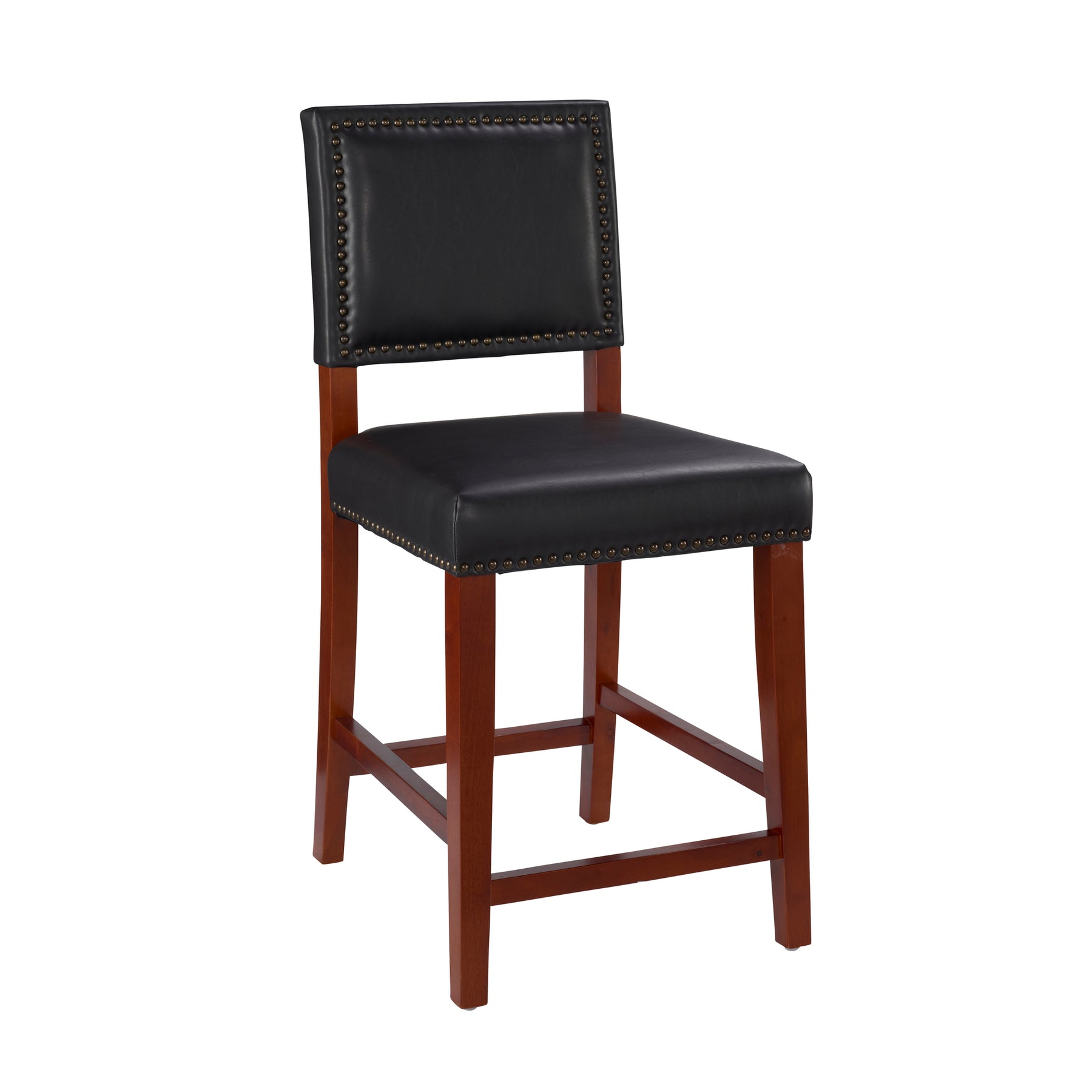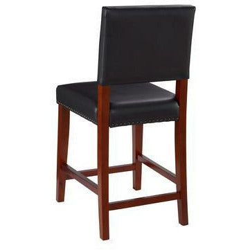 Create a contemporary look in your kitchen, dining or home pub area with the sleek shape and style of this Sapele finished 24" Brook Counter Stool. Solid legs give this courtly stool additional strength ensuring years of everyday use. The padded cushion will provide optimum comfort for you and your guests and is topped with durable black vinyl that is stain resistant, fade resistant and features tightly woven threads that won't break, mat or peel. Accented with antique bronze nail head trim. 275 pound weight limit.
