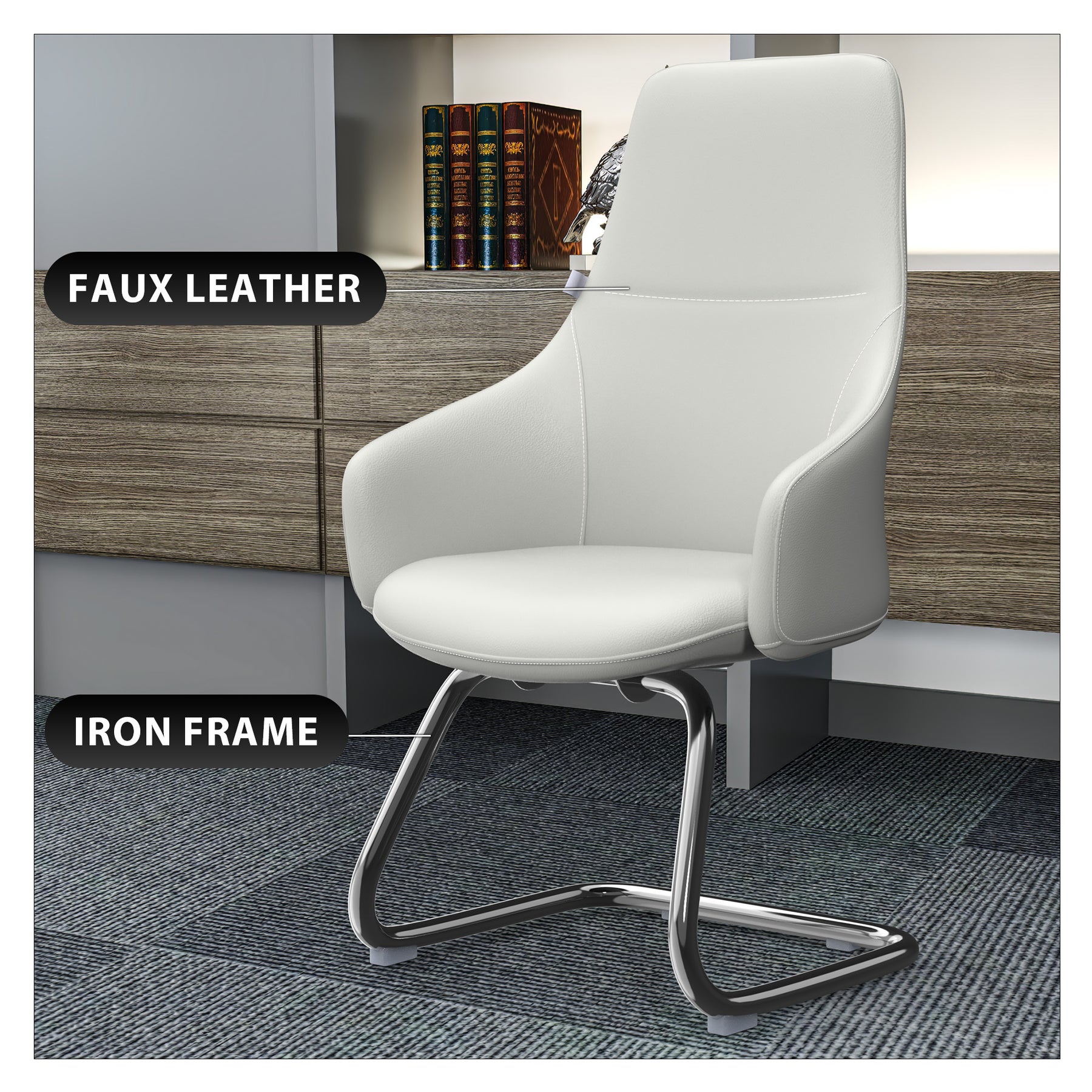 - The chair boasts a contemporary design that seamlessly integrates style and functionality. From the sleek iron frame to the faux leather upholstery, every detail contributes to a modern and elegant aesthetic.
