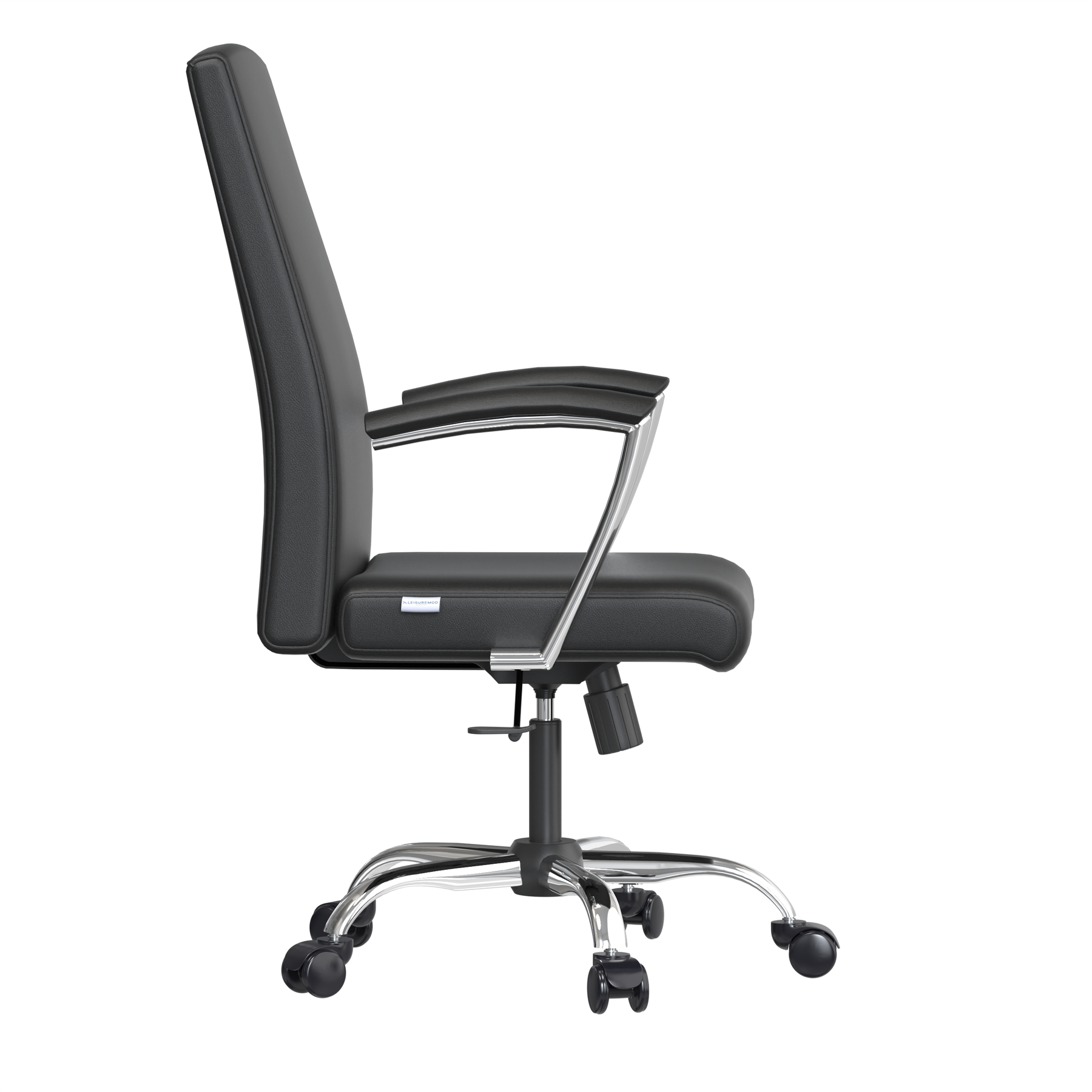 • The office chair features a sleek, ergonomic tilt for extended comfort, supported by upholstered leather for a luxurious feel and easy upkeep.