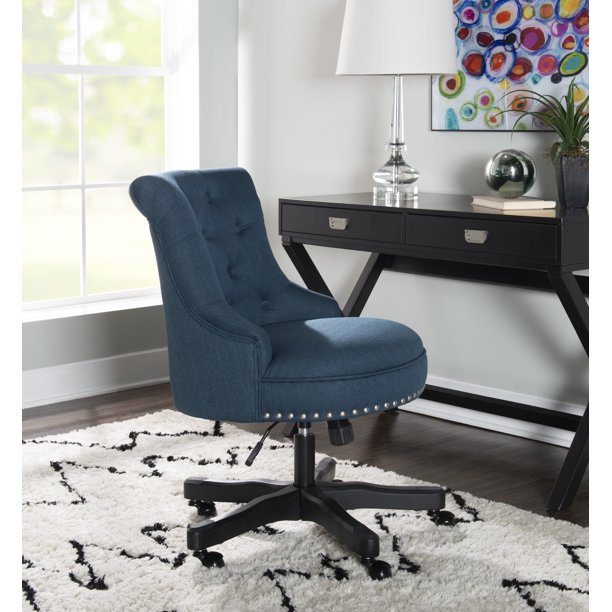 Add style and function to your office with the Sinclair Office Chair. The soft, plush frame features a button-tufted back and is upholstered in azure blue with burnished nickel nailhead accents. A sturdy black wood base is set upon durable metal casters for easy mobility. An adjustable seat height ensures this chair works for a variety of table heights. Perfect for a home workspace or an added touch of comfort at the office.