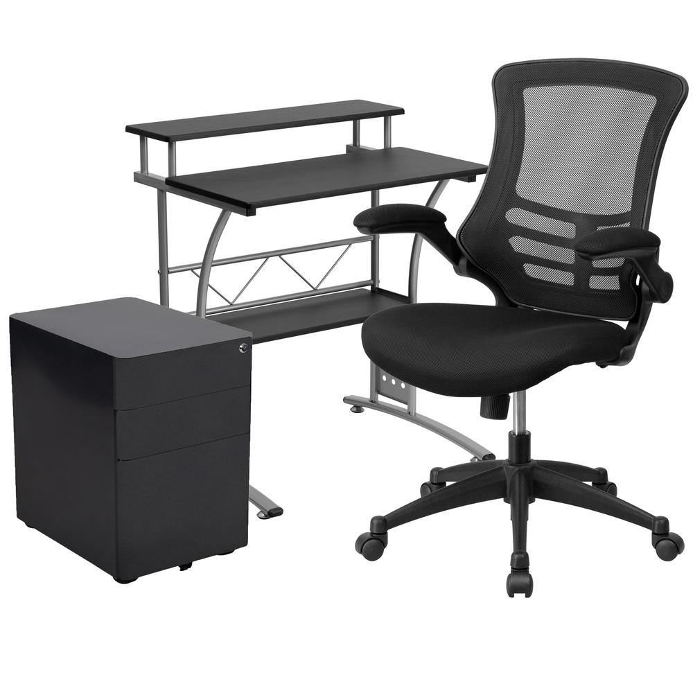Work From Home Kit - Black Computer Desk, Ergonomic Mesh Office Chair and Locking Mobile Filing Cabinet with Side Handles
