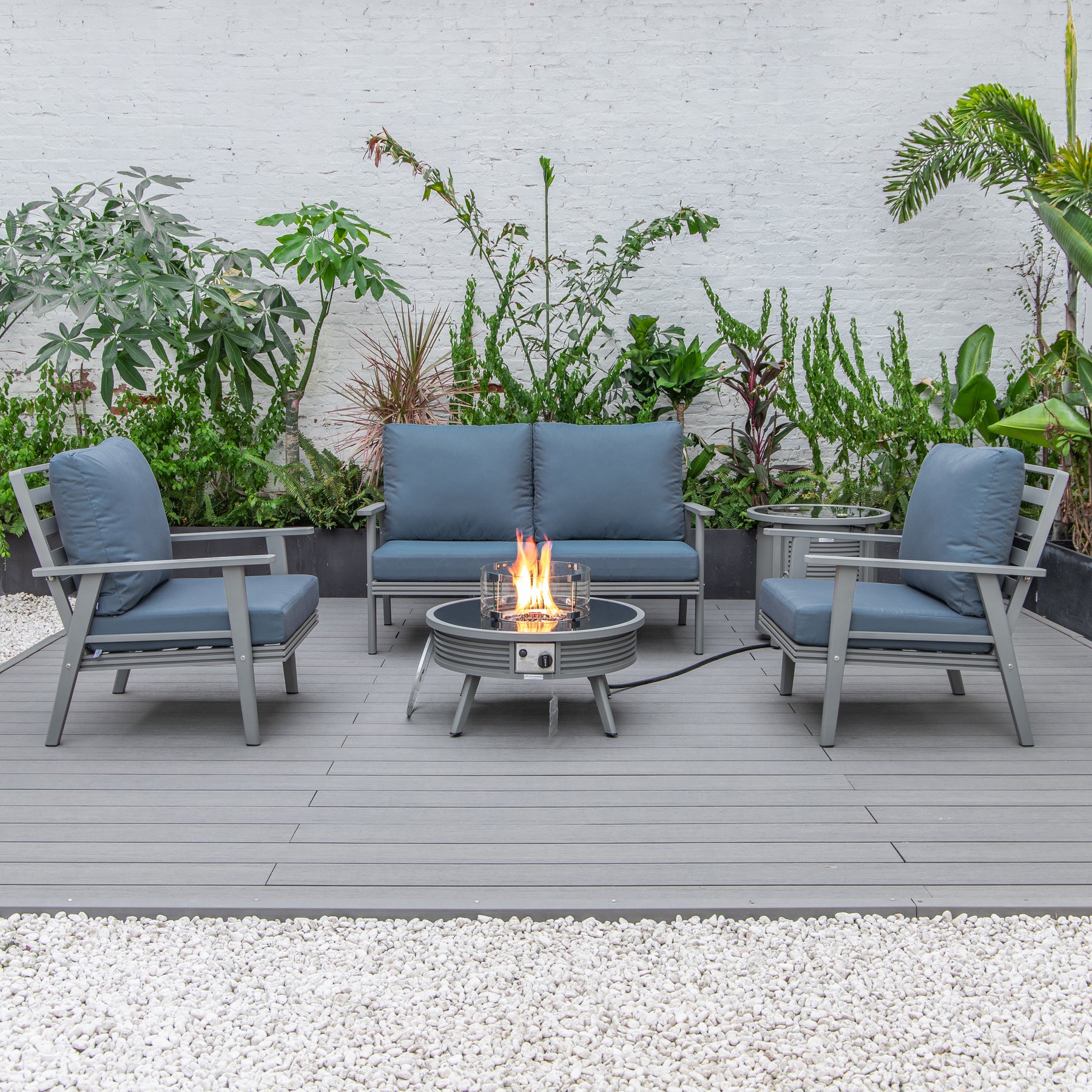 Enjoy cocktails with a friend in your backyard with this inviting Patio conversation set. The Wallbroke collection is the perfect option to relax under the sun or gaze at the stars while enjoying the amazing outdoors. The Set Includes a Loveseat, 2 Armchairs, a Fire Pit Table, and a Tank Holder. The Fire Pit Table will keep you warm during chilly weather. The cushions are stuffed with super-soft, Cotton fill for a custom seating experience. This decorative set is weather-resistant and boasts beautiful powder-coated Aluminum for long-lasting use. The 5-piece Conversation set fits up to 4 adults comfortably and adds the perfect experience to any outdoor space and is a durable choice that can stay in good shape for years. It has a modern style, which brings a timeless feel to your patio.