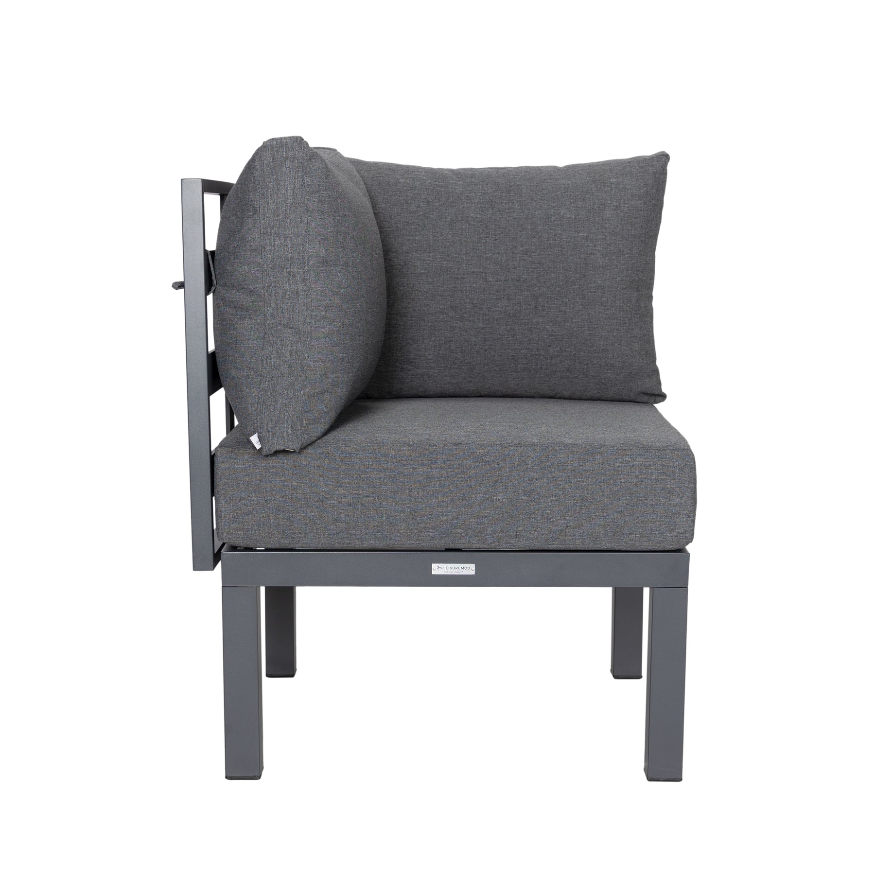 Unveil the epitome of outdoor luxury with the Chelsea Mid-Century Modern 6-Piece Sectional Set, meticulously crafted to combine innovative design, resilience, and unparalleled comfort. This comprehensive ensemble redefines the concept of outdoor living, turning your patio or backyard into a space that seamlessly merges style and relaxation. The patio set comprises 2 corner chairs and 2 armless chairs and 2 armchairs, forming a versatile and spacious seating arrangement. The structural backbone of the Chelsea set is crafted from premium aluminum and adorned with a sophisticated powder-coated finish in classic black, imparting an understated elegance that seamlessly blends with any outdoor aesthetic. Designed to withstand the rigors of changing weather, the Chelsea set is not only weather-resistant but also rust-resistant. Experience a new dimension of comfort with the plush, removable cushions that grace the patio set. Crafted for indulgence, these cushions offer a luxurious seating experience. The attention to detail extends to the cushion design, featuring ties that elegantly secure them to the chairs preventing the cushions from shifting. Preserving the integrity of your outdoor flooring, each chair in the Chelsea set is equipped with plastic cap floor protectors that shield your patio or deck from scratches and scuffs. Its assembly process is designed with your convenience in mind. Clear and concise instructions, along with all the necessary hardware, make the assembly a manageable task.