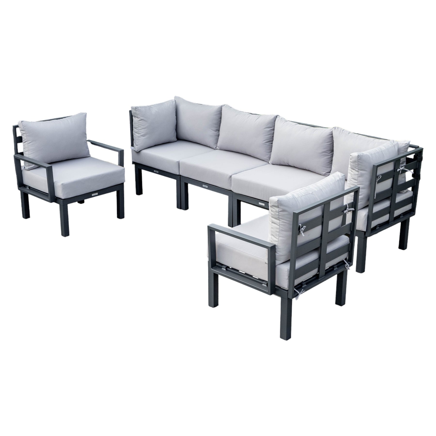 Unveil the epitome of outdoor luxury with the Chelsea Mid-Century Modern 6-Piece Sectional Set, meticulously crafted to combine innovative design, resilience, and unparalleled comfort. This comprehensive ensemble redefines the concept of outdoor living, turning your patio or backyard into a space that seamlessly merges style and relaxation. The patio set comprises 2 corner chairs and 2 armless chairs and 2 armchairs, forming a versatile and spacious seating arrangement. The structural backbone of the Chelsea set is crafted from premium aluminum and adorned with a sophisticated powder-coated finish in classic black, imparting an understated elegance that seamlessly blends with any outdoor aesthetic. Designed to withstand the rigors of changing weather, the Chelsea set is not only weather-resistant but also rust-resistant. Experience a new dimension of comfort with the plush, removable cushions that grace the patio set. Crafted for indulgence, these cushions offer a luxurious seating experience. The attention to detail extends to the cushion design, featuring ties that elegantly secure them to the chairs preventing the cushions from shifting. Preserving the integrity of your outdoor flooring, each chair in the Chelsea set is equipped with plastic cap floor protectors that shield your patio or deck from scratches and scuffs. Its assembly process is designed with your convenience in mind. Clear and concise instructions, along with all the necessary hardware, make the assembly a manageable task.