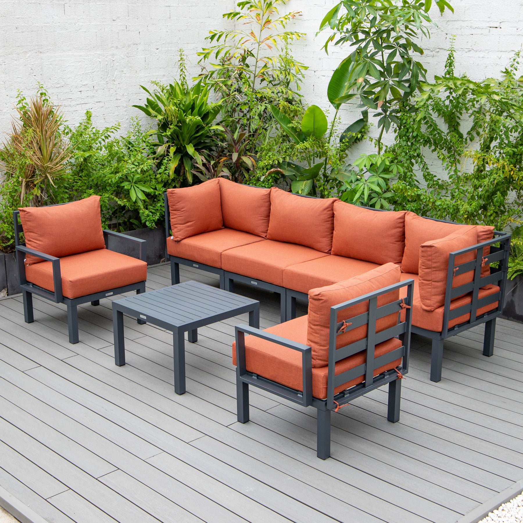 Elevate your outdoor living to new heights with the Chelsea Modern 7-Piece Patio Set. Crafted with meticulous attention to detail, this ensemble combines avant-garde design, unwavering durability, and uncompromising comfort. set comprises 2 corner chairs, 2 armless chairs, 2 armchairs, and a versatile square coffee table. The configuration is designed with flexibility in mind, allowing you to create intimate conversation corners and spacious lounging areas. The Chelsea set stems from its sturdy aluminum frame. Aluminum's lightweight nature, coupled with its resistance to corrosion, makes it an ideal choice for outdoor furniture. Crafted to withstand the elements, the patio set is both weather-resistant and rust-resistant. Indulge in the plush embrace of removable cushions that adorn the patio set. Designed for supreme comfort, these cushions not only elevate your lounging experience but also bring an element of luxury to your outdoor space. Preserving the integrity of your outdoor flooring, each chair in the patio set is equipped with plastic cap floor protectors. Clear and comprehensive instructions, coupled with all the necessary hardware, facilitate a manageable assembly experience.