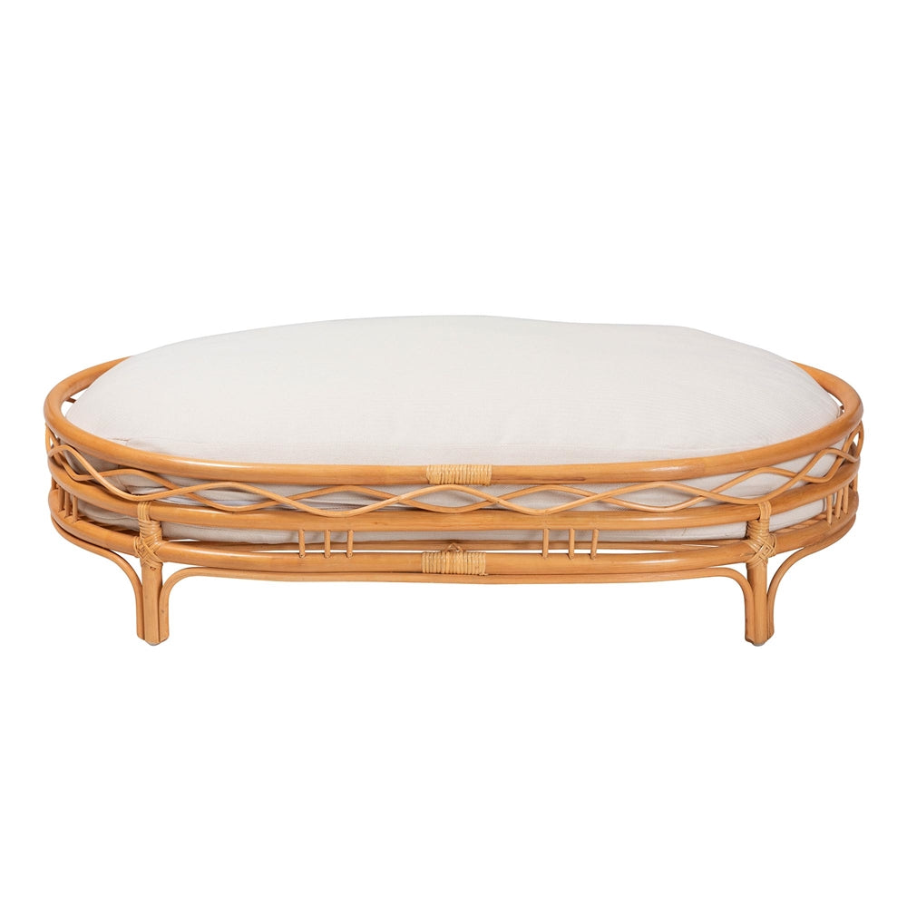 Facilitate your beloved animal companion to enjoy serene relaxation with the lovely Jovia pet bed. Made in Indonesia, this bohemian piece is handcrafted from natural rattan by skilled artisans. The oval silhouette features a unique openwork design rich with geometric charm to cradle your pet with a sense of rustic grace. The Jovia will arrive fully assembled and is fitted with a removable cushion padded with plush foam and upholstered in sumptuous fabric for a superb embrace. Channeling the carefree nature of paradise, the Jovia pet bed is sure to become a beloved fixture in any space. Disclaimer: Rattan is a product of nature and may have variations in areas such as, but not limited to, color, pattern, grain and texture. The hair-like strands of rattan/rattan-fiber are common due to the nature of the material.
