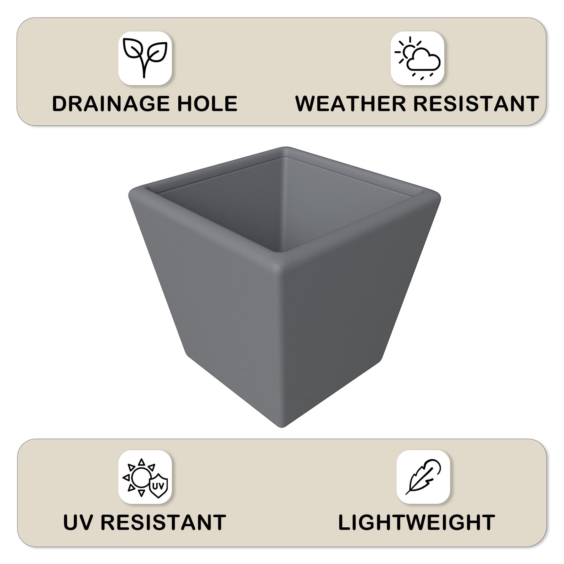 - The planter is built to withstand the elements. Its weather-resistant properties ensure that it can endure exposure to sunlight, rain, and fluctuating temperatures without compromising its structural integrity or aesthetic appeal.