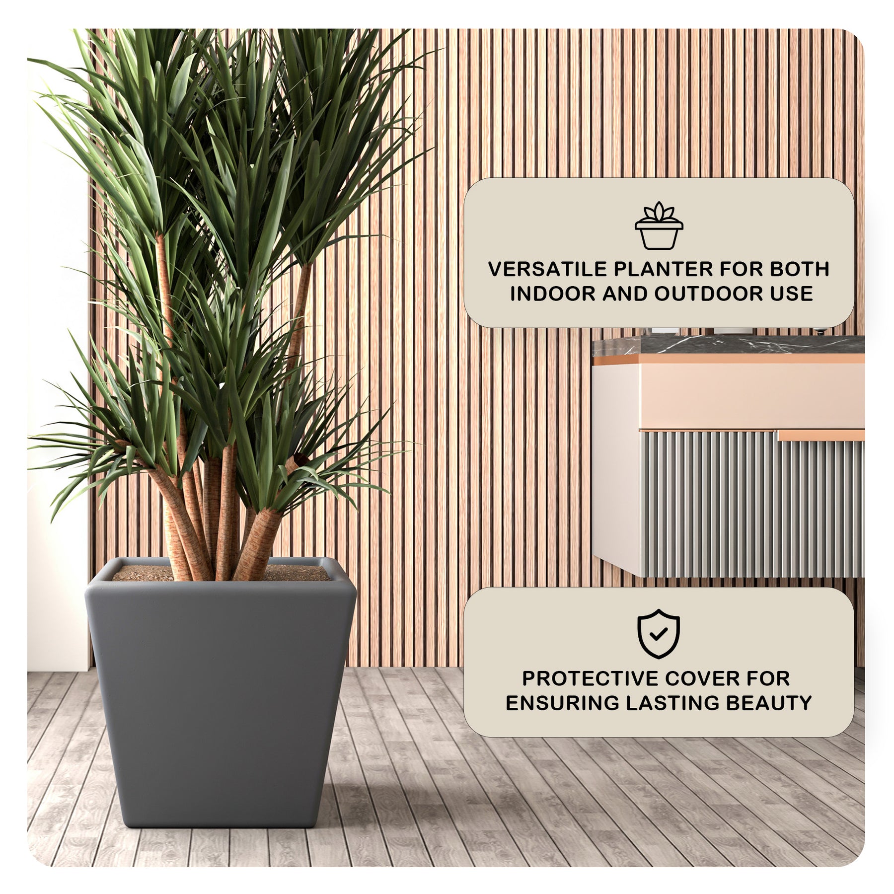 - The planter is built to withstand the elements. Its weather-resistant properties ensure that it can endure exposure to sunlight, rain, and fluctuating temperatures without compromising its structural integrity or aesthetic appeal.
