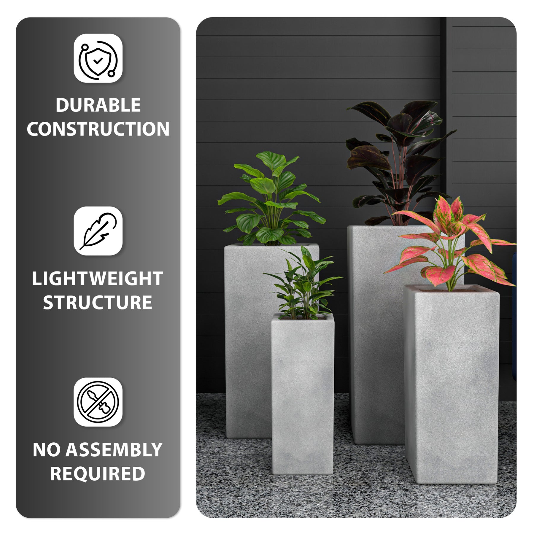 - Forget about time-consuming assembly! This planter arrives conveniently ready to use, saving you valuable time and effort. Simply unpack, add your favorite plant, and watch your space transform with a touch of modern elegance.