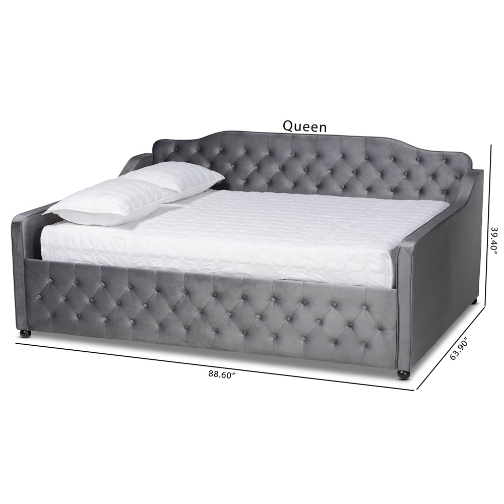 Freda Transitional and Contemporary Grey Velvet Fabric Upholstered and Button Tufted Queen Size Daybed