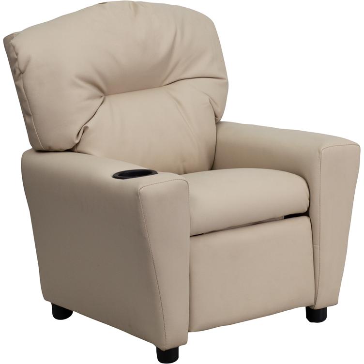 Contemporary Beige Vinyl Kids Recliner with Cup Holder