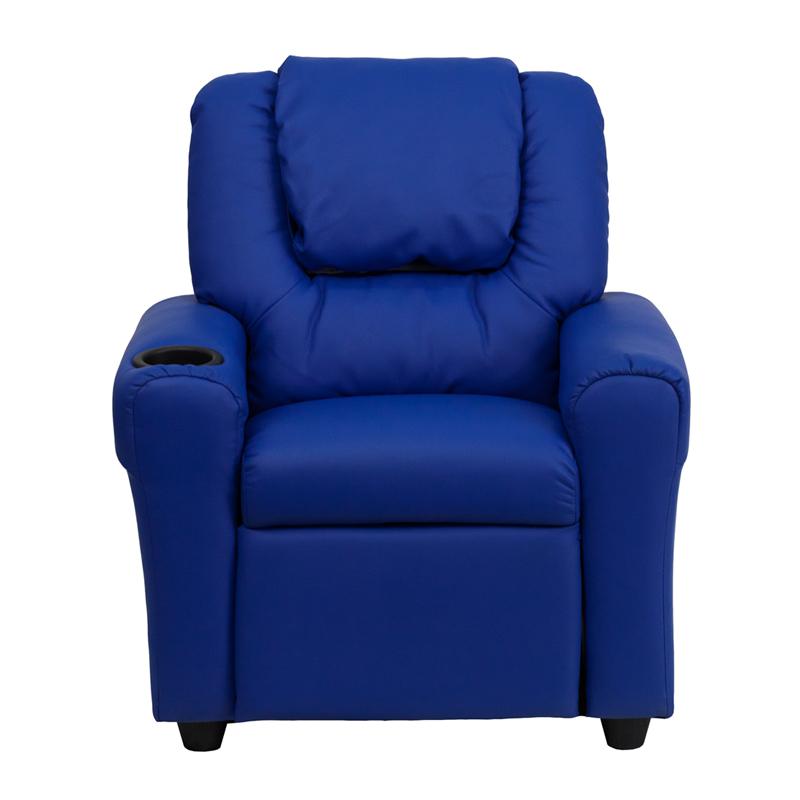 Contemporary Blue Vinyl Kids Recliner with Cup Holder and Headrest