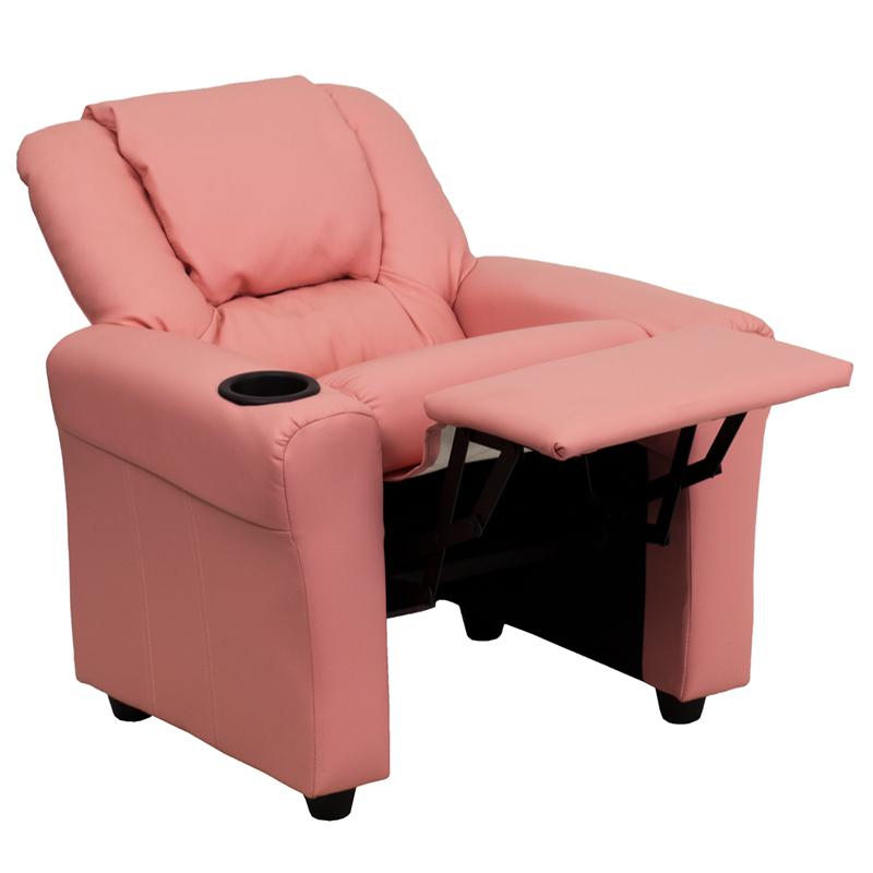 Contemporary Pink Vinyl Kids Recliner with Cup Holder and Headrest