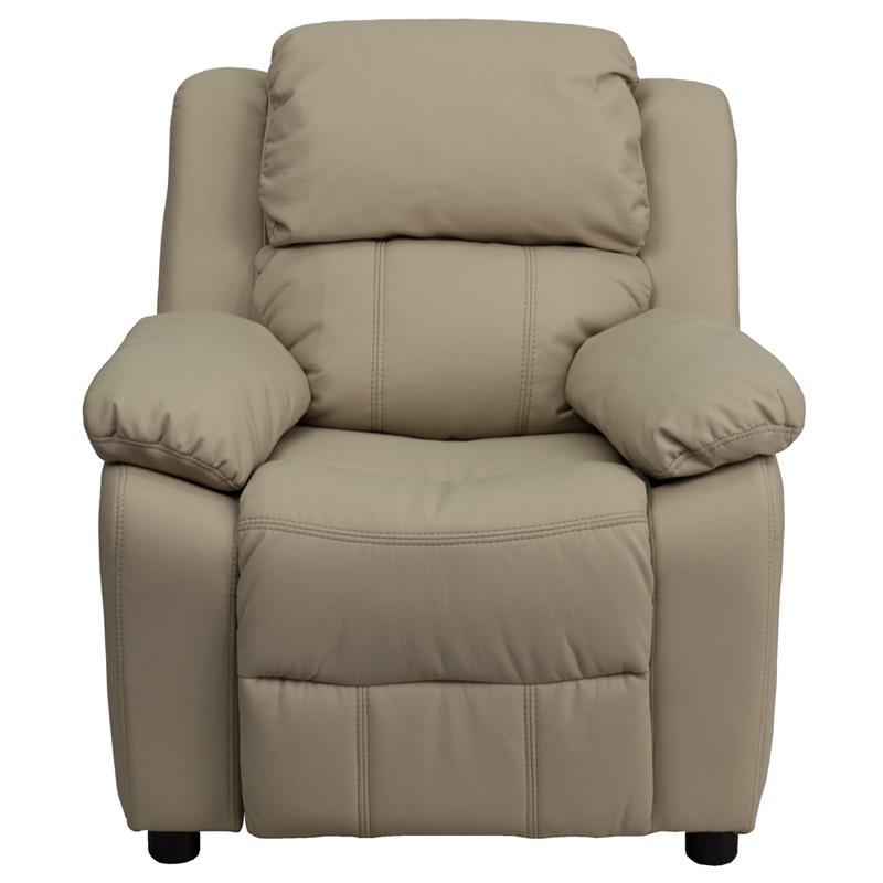 Deluxe Padded Contemporary Beige Vinyl Kids Recliner with Storage Arms