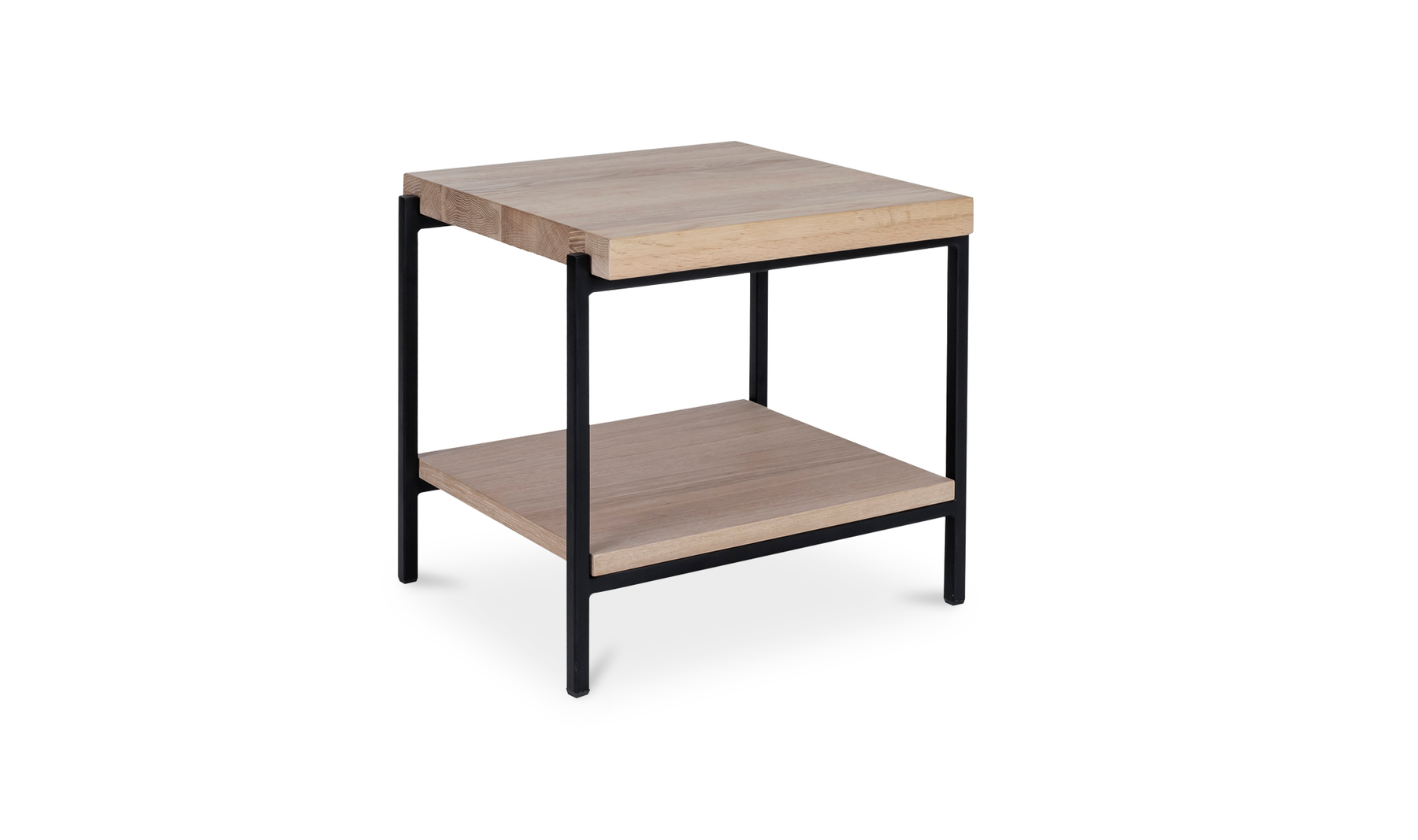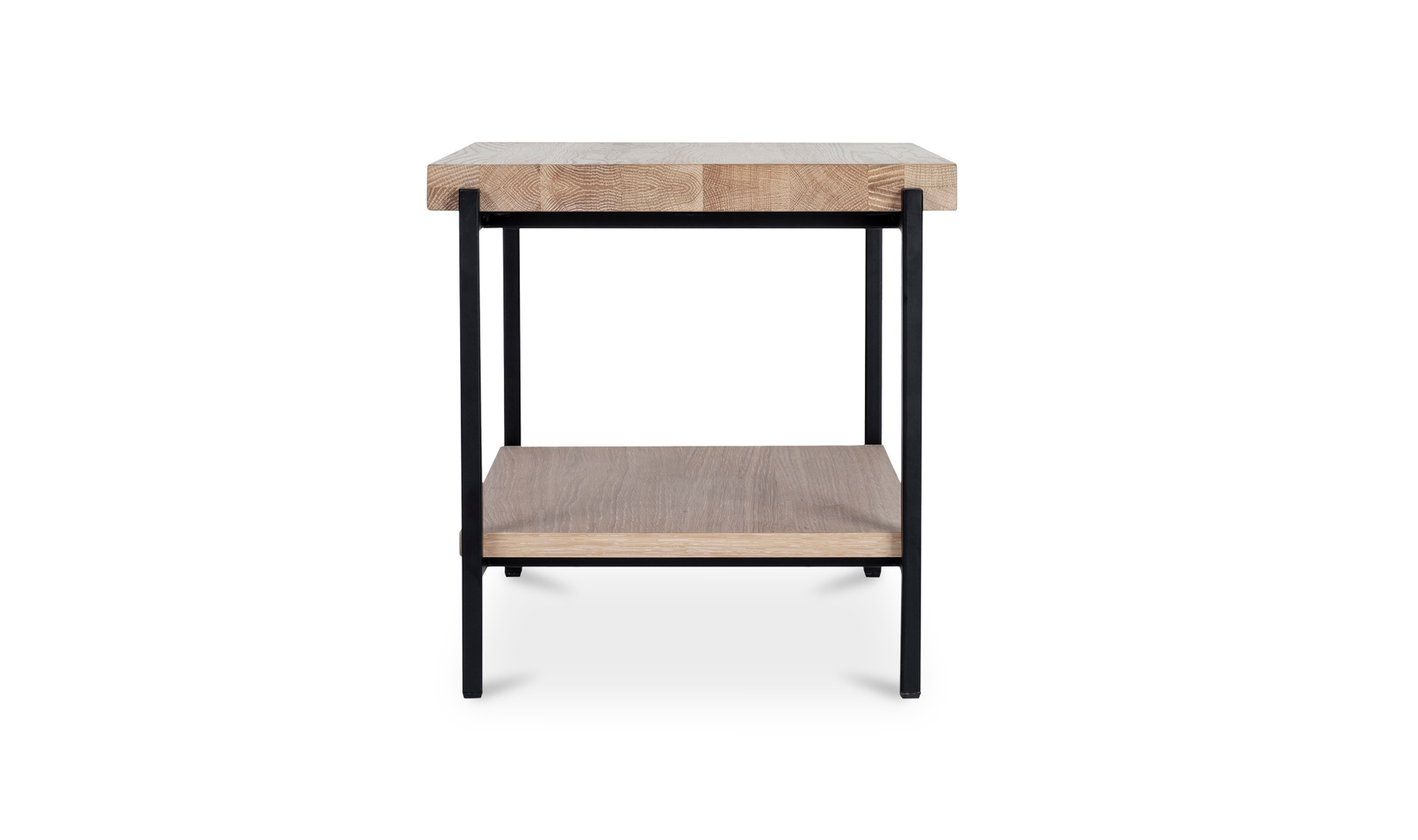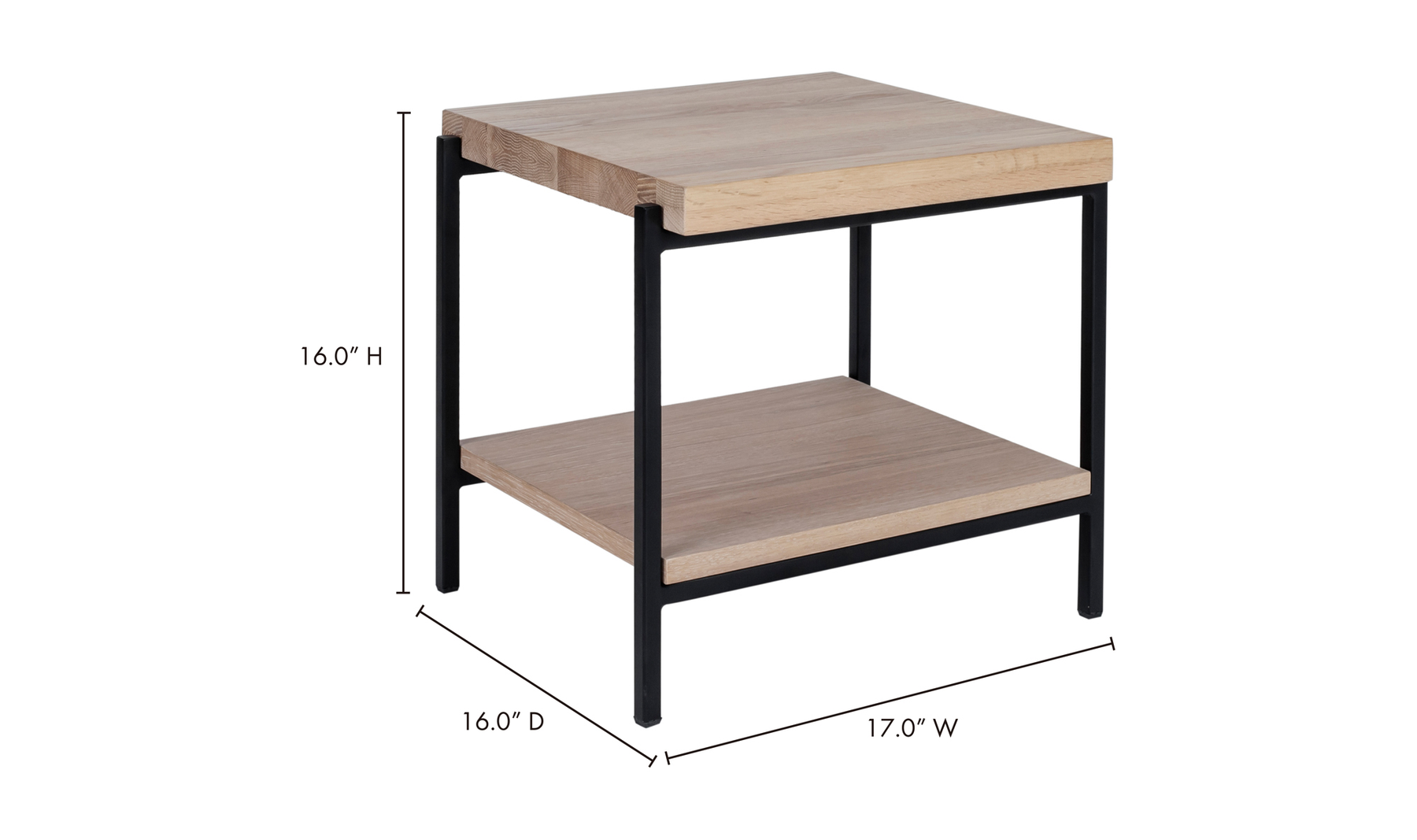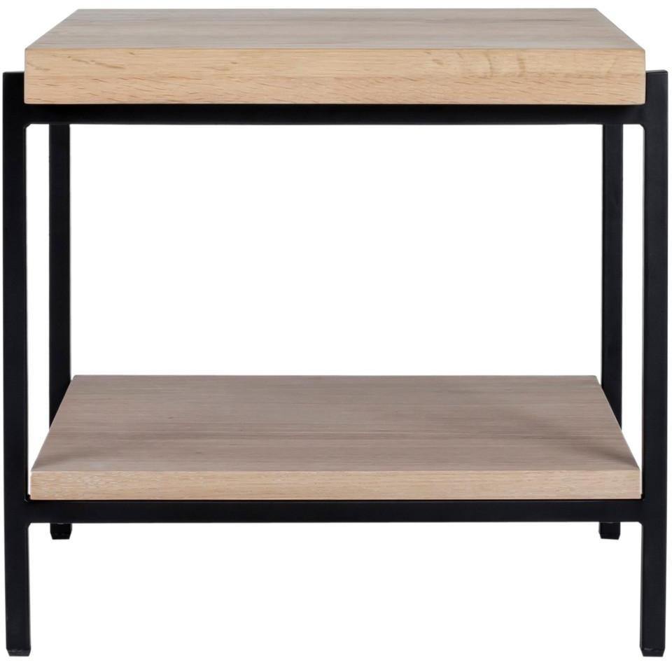 Rugged chic. This richly textured solid oak table top features its own unique knots, whorls, and woodgrain. Strong metal legs give it a stylish industrial finish. With two tiers, it comfortably fits all of your treasures from magazines to TV remotes to accent pieces.Solid oak wood constructionMetal legsTwo-tieredContemporary modern styleWipe wooden furniture down regularly with a clean, dry cloth to remove dust. Use warm water and a mild soap to clean wooden furniture. Place your wooden furniture away from prolonged direct sunlight as this can result in 'spotting,' a phenomenon where bright and dark spots appear across the surface.Made in VietnamContemporary Modern. Color: White Oil and Black Metal We offer 2 Years warranty. Dimension:17W 16D 16H. Product Weight:19.00 lbs. Material: Solid Oak WoodMetalWe understand how important your home is and how decorating your kitchen, dining room or bedrooms with classy, contemporary furnishings can help make it a place that reflects who you are. We believe in the power modern furniture has in creating not just a home but YOUR home. We believe in feeling good about our home's environment, and we think you do too.