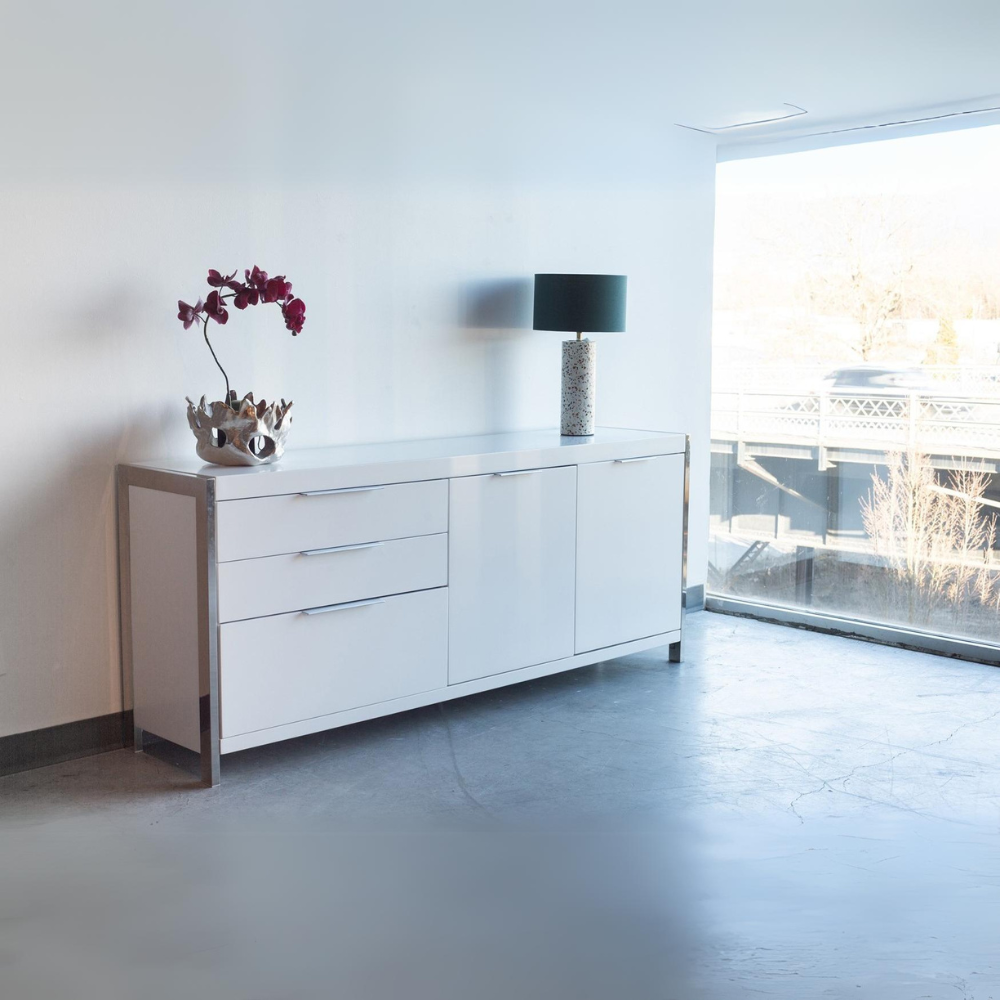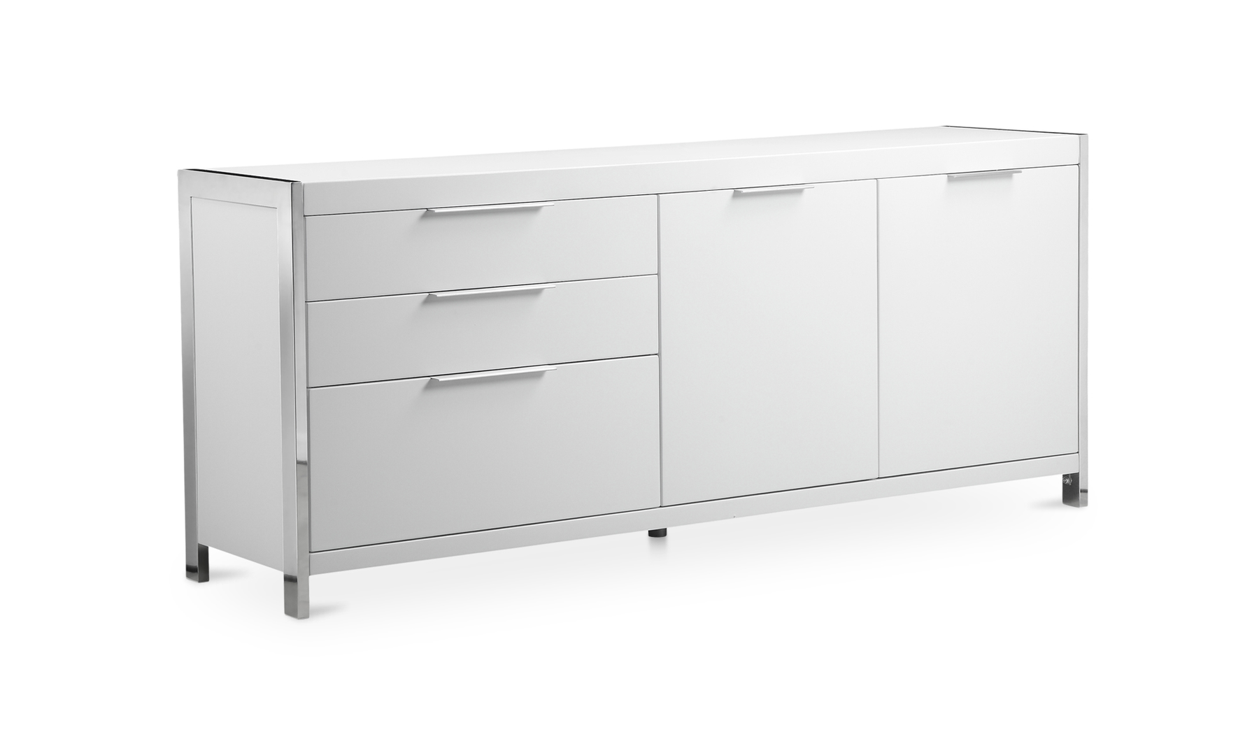 Clean and contemporary in an all white finish, the Neo will help make your home feel open and spacious. With three drawers, and two doors that open up to shelving, there is loads of storage potential. The lacquered cabinet is a breeze to keep clean while the steel frame and hardware complete the look.Wipe up spills immediately with a clean dry cloth.