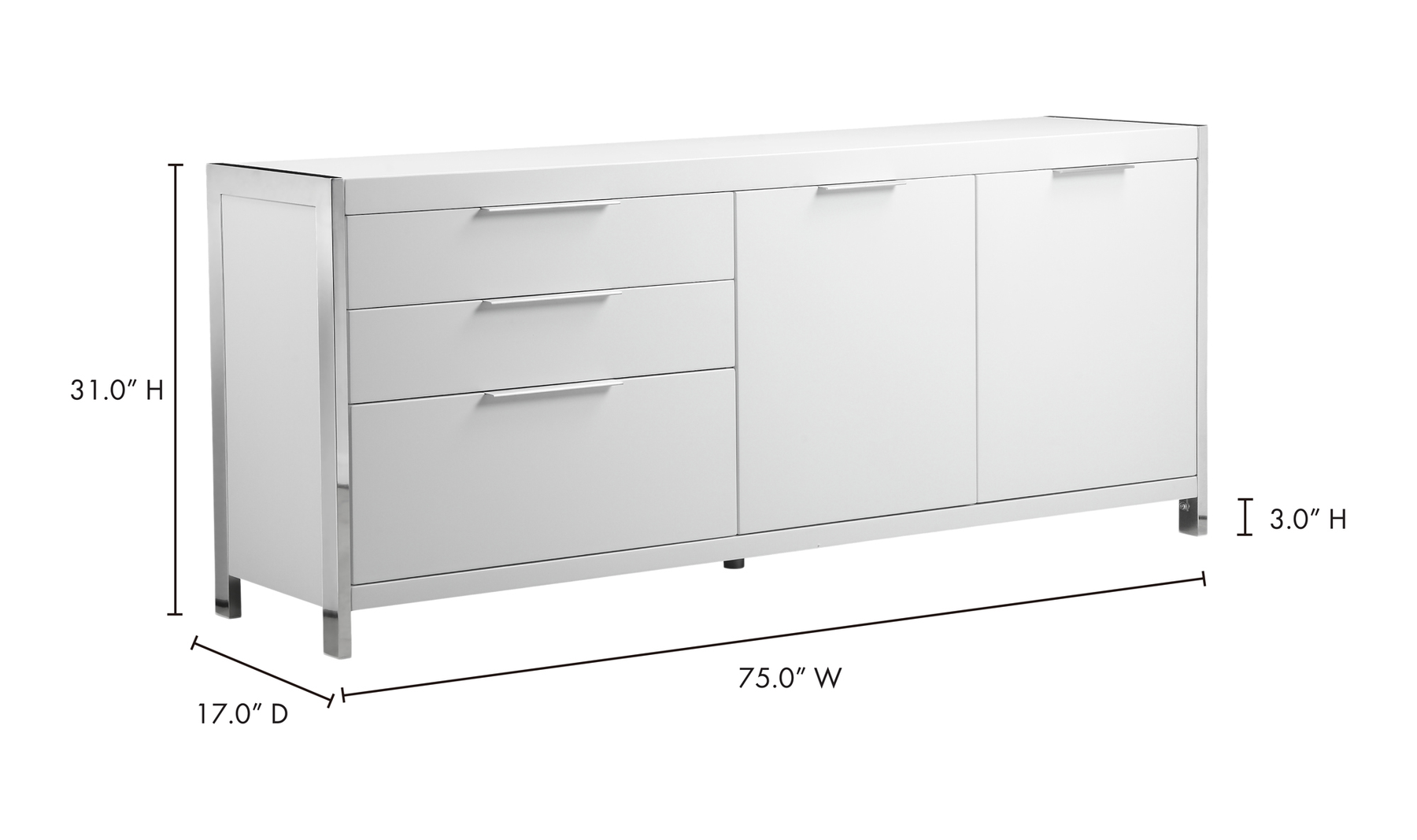 If the surface becomes chipped or scratched, rust or corrosion may occur due to the area being exposed to air. If rusting begins to occur, clean the affected area with a wire brush or steel wool. Recoat the repaired area with an appropriate finish for metal surfaces to stop deterioration.Made in ChinaContemporary Modern. Color: White We offer 1 Year warranty. Dimension:75W 17D 31H. Product Weight:181.00 lbs. Material: Polished Stainless SteelLacquered MDFWe understand how important your home is and how decorating your kitchen, dining room or bedrooms with classy, contemporary furnishings can help make it a place that reflects who you are. We believe in the power modern furniture has in creating not just a home but YOUR home. We believe in feeling good about our home's environment, and we think you do too.