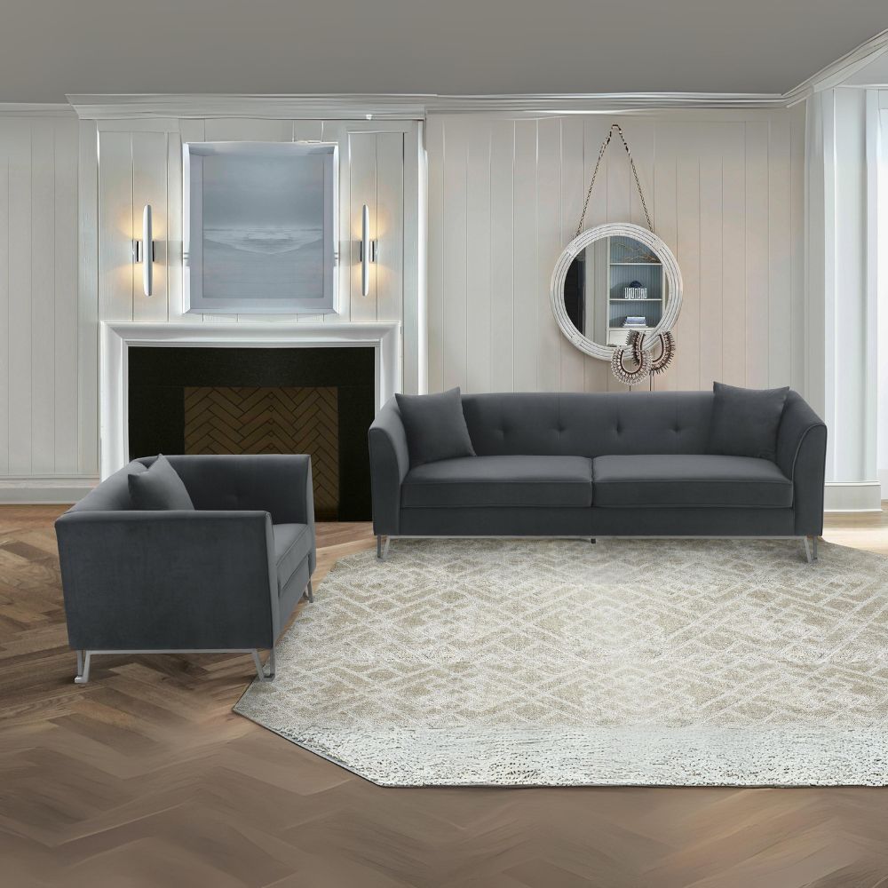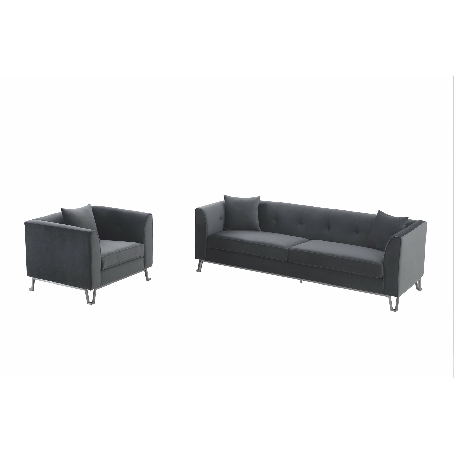 The Armen Living Everest 2 Piece Fabric Sofa & Chair Set in Gray is the perfect seating addition to bring into your beautiful home. The wide seat and high chair back and arms on both the chair and sofa will encapsulate your body and make you feel satisfied and secure. The incredibly comfortable foam-padded cushion will keep you relaxed all day long and make you never want to get up! The striking brushed stainless steel legs are a stand-out feature that compliments the fabric upholstery perfectly, while also adding to the uniqueness of this chair and sofa set. This wonderful chair and sofa set comes with 3 additional toss pillows to accessorize with. The Everest set is available in your color choice of blue, Gray, and blush fabric.
