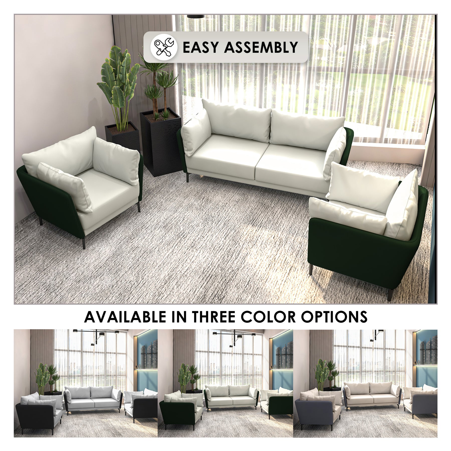 - The Luxify Sofa Set by LeisureMod includes two single-seater sofas and one three-seater sofa, providing a cohesive and stylish seating solution for your living space. This set enhances any room with its coordinated style, perfect for family gatherings, entertaining guests, or creating a luxurious lounging area.