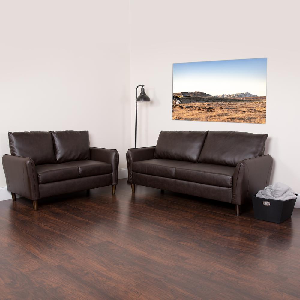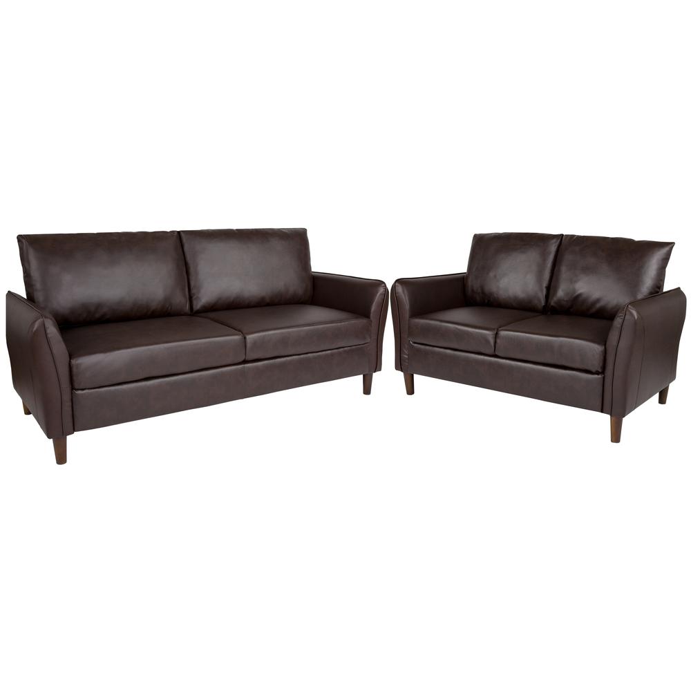 Milton Park Upholstered Plush Pillow Back Loveseat and Sofa Set in Brown LeatherSoft