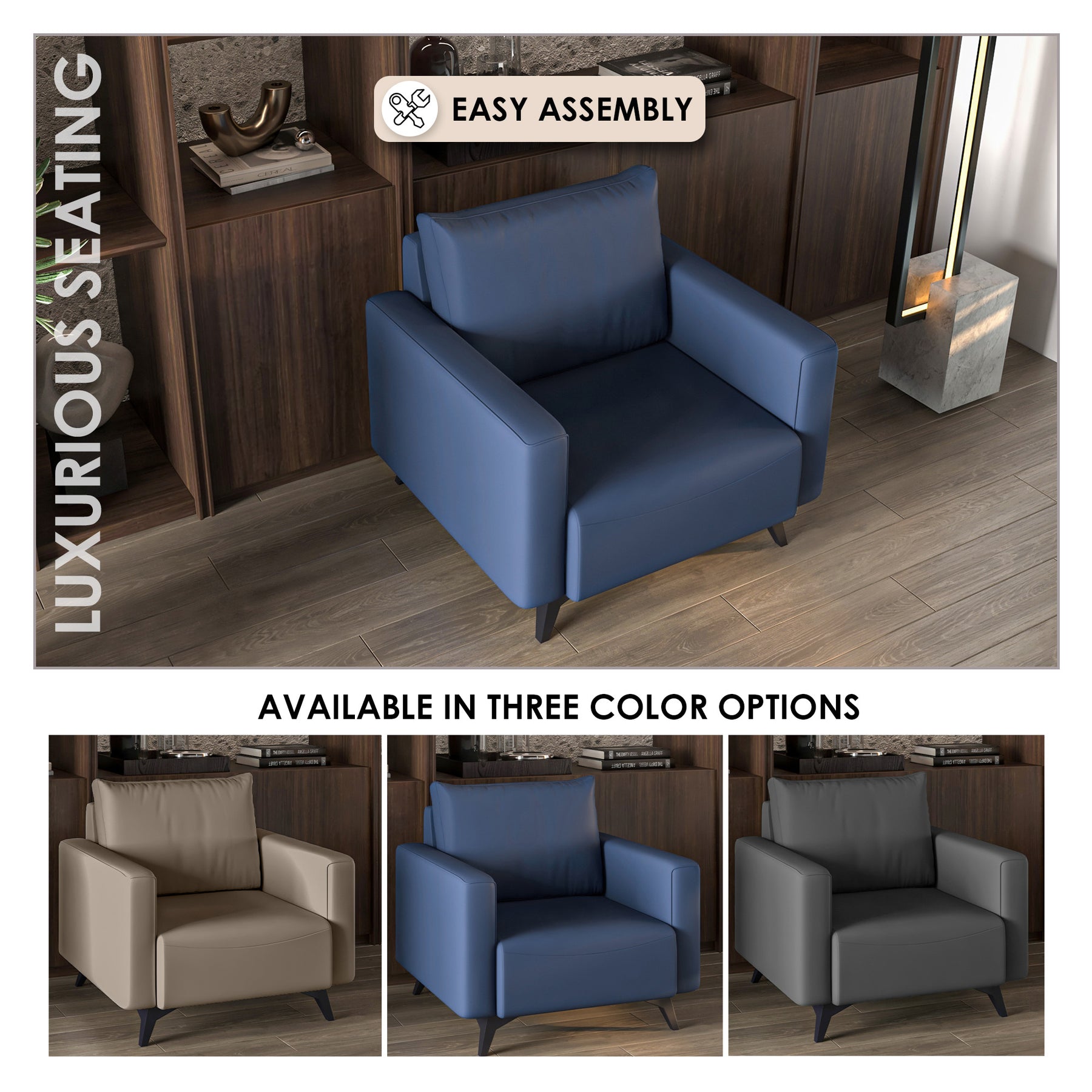 - The single-seater sofa combines modern elegance with cozy comfort. It's wrapped in premium vegan leather and features generous foam filling and plush, cushioned arms, giving you a luxurious and inviting place to sit. With its sleek design and top-notch materials, it's ideal for anyone who wants both style and comfort.