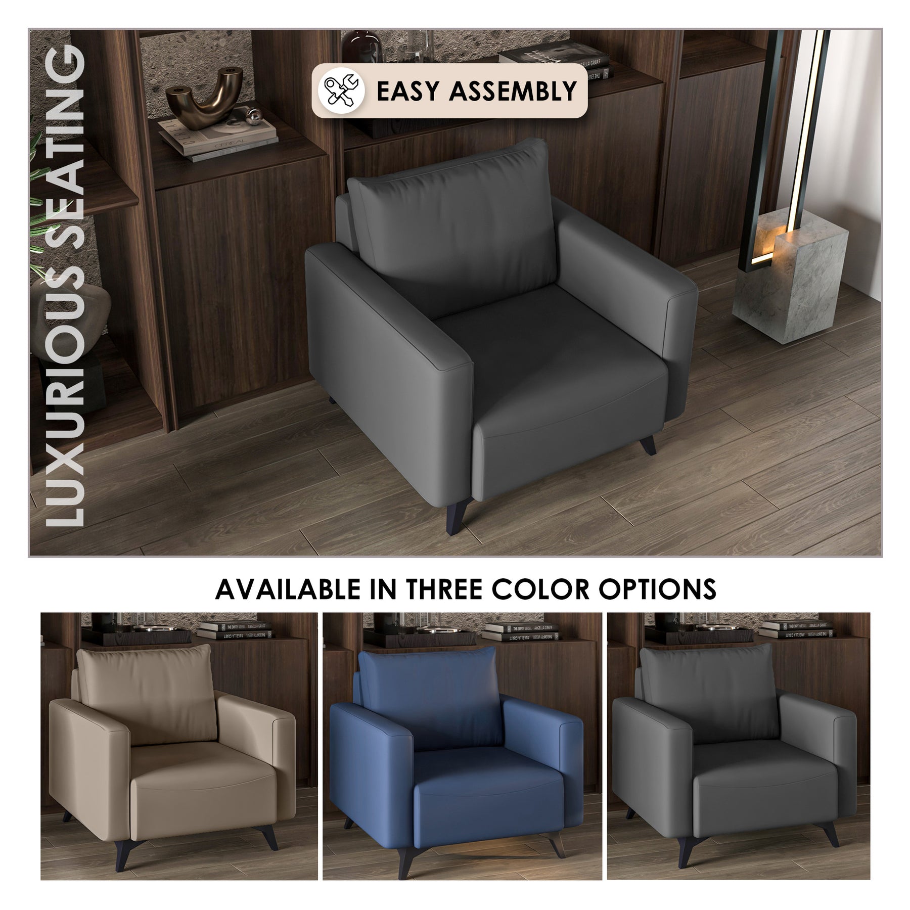 - The single-seater sofa combines modern elegance with cozy comfort. It's wrapped in premium vegan leather and features generous foam filling and plush, cushioned arms, giving you a luxurious and inviting place to sit. With its sleek design and top-notch materials, it's ideal for anyone who wants both style and comfort.