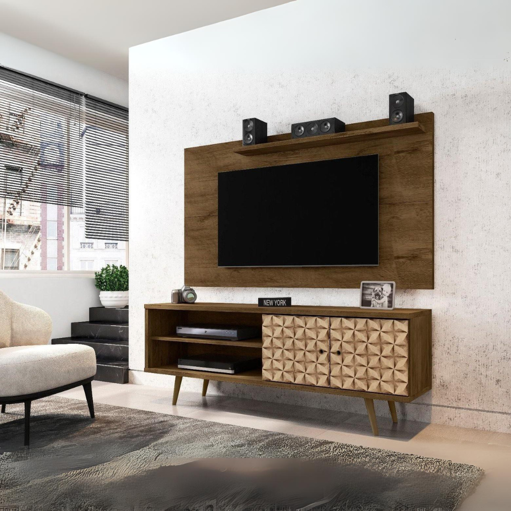 Liberty 62.99 Mid-Century Modern TV Stand and Panel with Solid Wood Legs in Rustic Brown and 3D Brown Prints